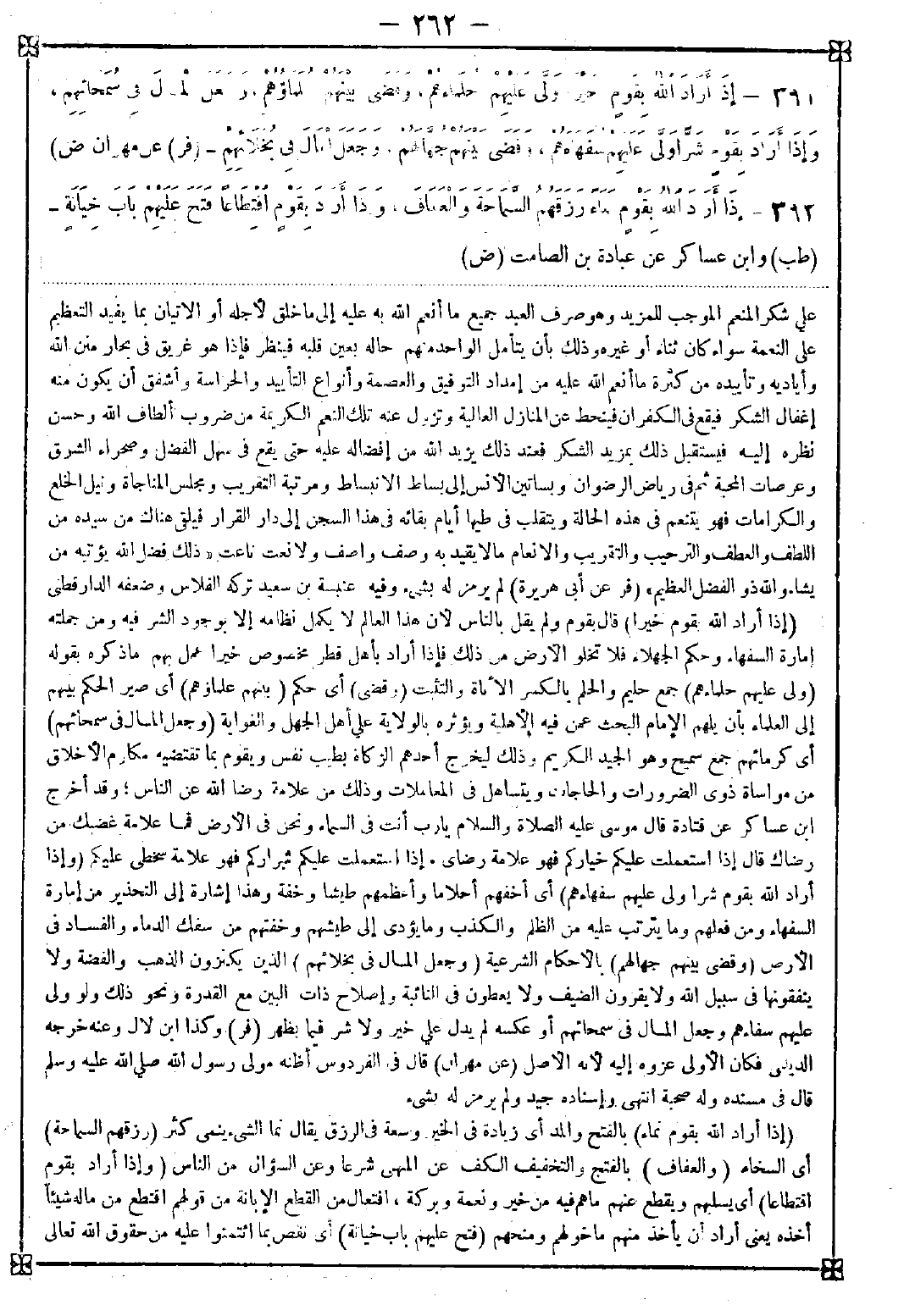 391 - (إذا أراد الله بقوم خيرا) قال بقوم ولم يقل بالناس لأن هذا العالم لا يكمل نظامه إلا بوجود الشر فيه ومن جملته إمارة السفهاء وحكم الجهلاء فلا تخلو الأرض من ذلك فإذا أراد بأهل قطر مخصوص خيرا عمل بهم ما ذكره بقوله (ولى عليهم حلمائهم) جمع حليم والحلم بالكسر الأناة والتثبت (وقضى) أي حكم (بينهم علماؤهم) أي صير الحكم بينهم إلى العلماء بأن يلهم الإمام البحث عمن فيه الأهلية ويؤثره بالولاية على أهل الجهل والغواية (وجعل المال في سمحائهم) أي كرمائهم جمع سميح وهو الجيد الكريم وذلك ليخرج أحدهم الزكاة بطيب نفس ويقوم بما تقتضيه مكارم الأخلاق من مواساة ذوي الضرورات والحاجات ويتساهل في المعاملات وذلك من علامة رضا الله عن الناس وقد أخرج ابن عساكر عن قتادة قال موسى عليه الصلاة والسلام يا رب أنت في السماء ونحن في الأرض فما علامة غضبك من رضاك قال إذا استعملت عليكم خياركم فهو علامة رضاي وإذا استعملت عليكم شراركم فهو علامة سخطي عليكم (وإذا أراد الله بقوم شرا ولى عليهم سفهاءهم) أي أخفهم أحلاما وأعظمهم طيشا وخفة وهذا إشارة إلى التحذير من إمارة السفهاء ومن فعلهم وما يترتب عليه من الظلم والكذب وما يؤدي إلى طيشهم وخفتهم من سفك الدماء والفساد في الأرض (وقضى بينهم جهالهم) بالأحكام الشرعية (وجعل المال في بخلائهم) الذين يكنزون الذهب والفضة ولا ينفقونها في سبيل الله ولا يقرون الضيف ولا يعطون في النائبة وإصلاح ذات البين مع القدرة ونحو ذلك ولو ولى عليهم سفهاءهم وجعل المال في سمحائهم أو عكسه لم يدل على خير ولا شر فيما يظهر
