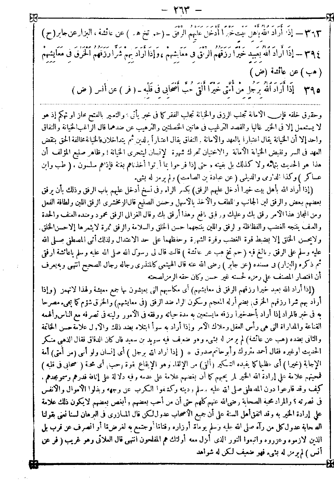 393 - (إذا أراد الله بأهل بيت خيرا أدخل عليهم الرفق) بكسر الراء وفي نسخ أدخل عليهم باب الرفق وذلك بأن يرفق بعضهم ببعض والرفق لين الجانب واللطف والأخذ بالأسهل وحسن الصنيع. قال الزمخشري: الرفق اللين ولطافة الفعل ومن المجاز هذا الأمر رفق بك وعليك ورفيق نافع وهذا أرفق بك وقال الغزالي: الرفق محمود وضده العنف والحدة والعنف ينتجه الغضب والفظاظة والرفق واللين ينتجهما حسن الخلق والسلامة والرفق ثمرة لا يثمرها إلا حسن الخلق ولا يحسن الخلق إلا بضبط قوة الغضب وقوة الشهوة وحفظهما على حد الاعتدال ولذلك أثنى المصطفى صلى الله عليه وسلم على الرفق وبالغ فيه