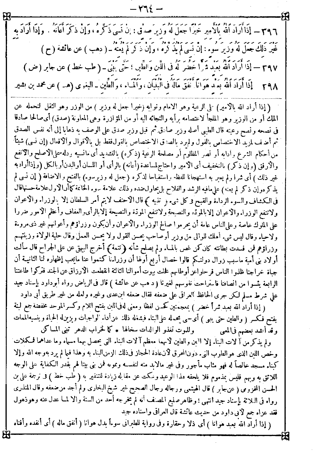 398 - (إذا أراد الله بعبد هوانا) أي ذلا وحقارة وفي رواية للطبراني سوءا بدل هوانا (أنفق ماله) أي أنفده وأفناه -[265]- يقال نفقت الدراهم نفدت ونفق الشيء نفقا فنى وأنفقته أفنيته (في البنيان) أي في أجر الصناع ونحو ذلك (و) في (الماء والطين) إذا كان البناء لغير غرض شرعي أو أدى لترك واجب أو فعل منهي عنه أو زاد على الحاجة وذلك هو المتوعد عليه لأن الدنيا ليست بدار قرار ولا يعمرها إلا الأشرار ولهذا قال عيسى عليه الصلاة والسلام إنما هي معبرة فاعبروها ولا تعمروها فإن قلت: ما فائدة قوله في الماء والطين بعد قوله في البنيان وهلا اكتفى به؟ قلت: الظاهر أنه أراد بالبنيان أجرة أرباب الحرف كما تقرر وبالماء والطين ثمن المؤن ويكون المراد إنفاقه في أجرة البناء وفي آلاته. قالوا: ولا ينبغي لمن مر على بناء مزخرف مشرف أن لا ينظر إليه لأنه إغراء لبانيه وأمثاله على ذلك إذ هو إنما فعل لينظر الناس إليه قال في الكاشف: قد شدد العلماء من أهل التقوى في وجوب غض البصر عن أبنية الظلمة وعدد الفسقة في اللباس والمراكب وغير ذلك لأنهم إنما اتخذوا هذه الأشياء لعيون النظارة فالناظر إليها محصل لغرضهم وكالمغري لهم على اتخاذها