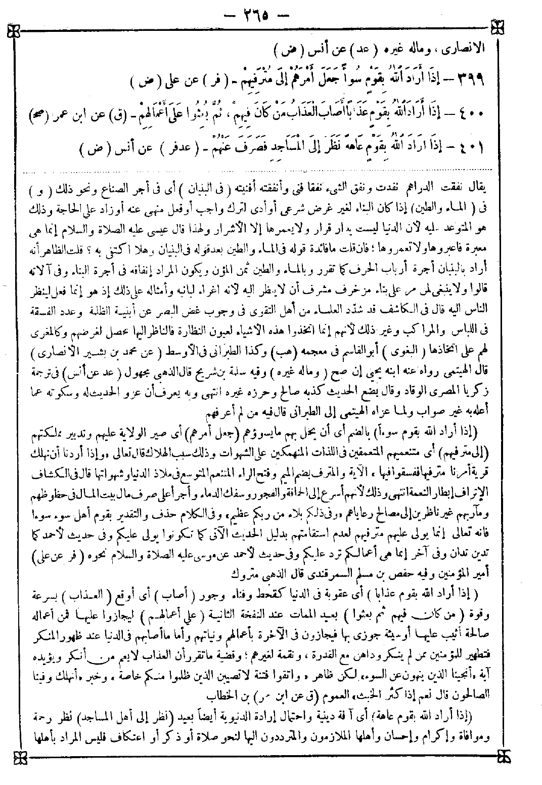 399 - (إذا أراد الله بقوم سوءا) بالضم أي أن يحل بهم ما يسوؤهم (جعل أمرهم) أي صير الولاية عليهم وتدبير مملكتهم (إلى مترفيهم) أي متنعميهم المتعمقين في اللذات المنهمكين على الشهوات وذلك سبب الهلاك قال تعالى {وإذا أردنا أن نهلك قرية أمرنا مترفيها ففسقوا فيها} الآية والمترف بضم الميم وفتح الراء المتنعم المتوسع في ملاذ الدنيا وشهواتها قال في الكاشف: الإتراف إبطار النعمة انتهى وذلك لأنهم أسرع إلى الحماقة والفجور وسفك الدماء وأجرأ على صرف مال بيت المال في حظوظهم ومآربهم غير ناظرين إلى مصالح رعاياهم {وفي ذلكم بلاء من ربكم عظيم} وفي الكلام حذف والتقدير بقوم أهل سوء سوءا فإنه تعالى إنما يولي عليهم مترفيهم لعدم استقامتهم بدليل الحديث الآتي كما تكونوا يولى عليكم وفي حديث لأحمد كما تدين تدان وفي آخر إنما هي أعمالكم ترد عليكم وفي حديث لأحمد عن موسى عليه الصلاة والسلام نحوه