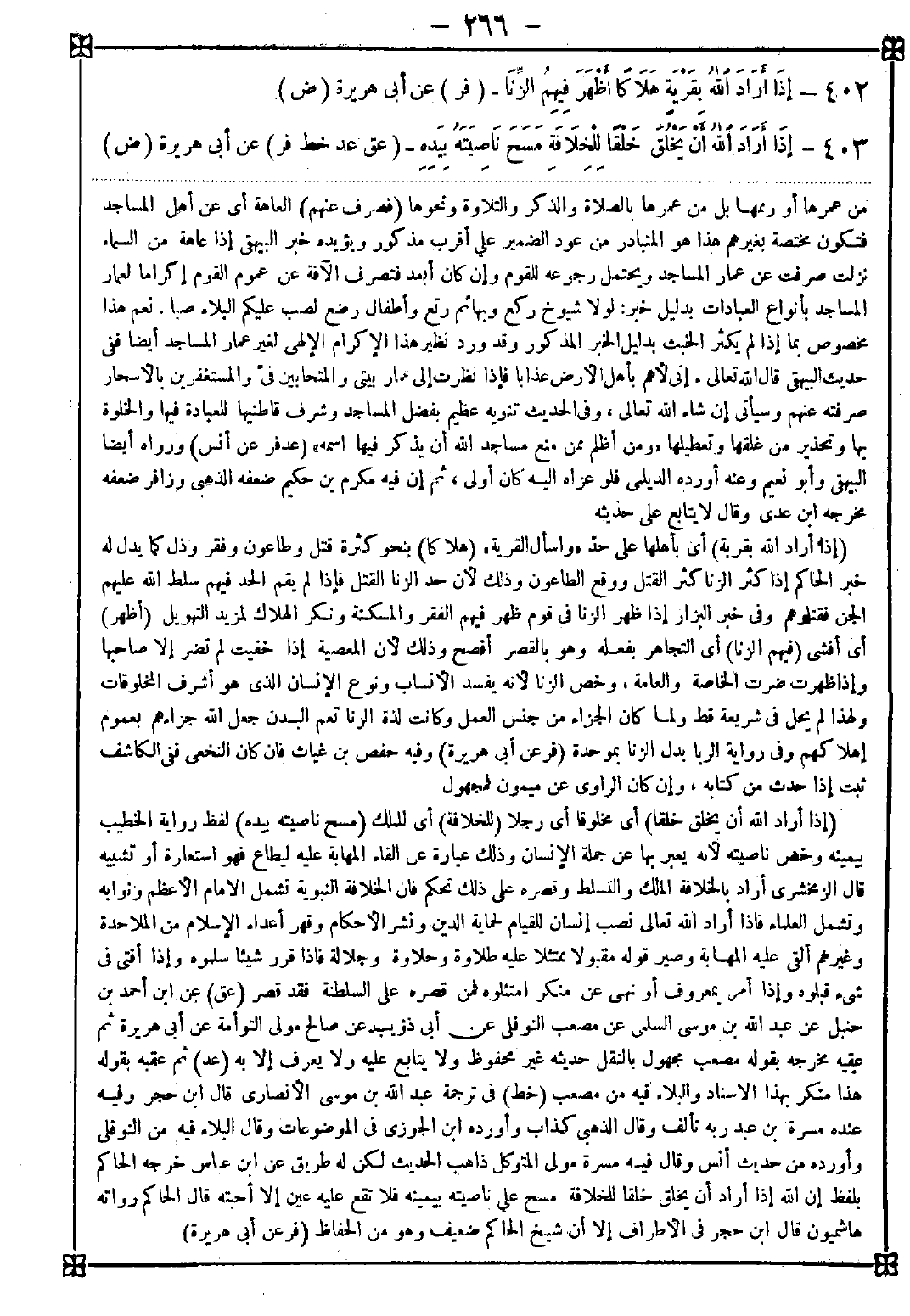 403 - (إذا أراد الله أن يخلق خلقا) أي مخلوقا أي رجلا (للخلافة) أي للملك (مسح ناصيته بيده) لفظ رواية الخطيب بيمينه وخص ناصيته لأنه يعبر بها عن جملة الإنسان وذلك عبارة عن إلقاء المهابة عليه ليطاع فهو استعارة أو تشبيه. قال الزمخشري: أراد بالخلافة الملك والتسلط وقصره على ذلك تحكم فإن الخلافة النبوية تشمل الإمام الأعظم ونوابه وتشمل العلماء فإذا أراد الله تعالى نصب إنسان للقيام لحماية الدين ونشر الأحكام وقهر أعداء الإسلام من الملاحدة وغيرهم ألقى عليه المهابة وصير قوله مقبولا ممتثلا عليه طلاوة وحلاوة وجلالة فإذا قرر شيئا سلموه وإذا أفتى في شيء قبلوه وإذا أمر بمعروف أو نهى عن منكر امتثلوه فمن قصره على السلطنة فقد قصر