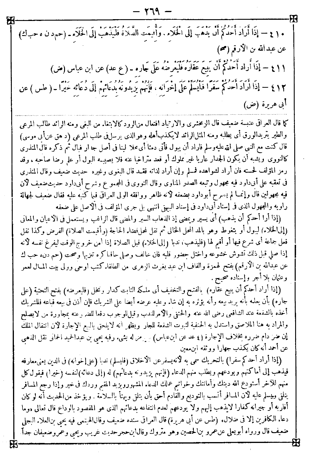 411 - (إذا أراد أحدكم أن يبيع عقاره) بالفتح والتخفيف أي ملكه الثابت كدار ومحل (فليعرضه) بفتح التحتية (على جاره) بأن يعلمه بأنه يريد بيعه وأنه يؤثره به إن شاء وعليه عرضه أيضا على الشريك فإن أذن في بيعه فباعه فللشريك أخذه بالشفعة عند الشافعي رضي الله عنه والحنفي والأمر للندب وقيل للوجوب دفعا للضرر وعنه بمجاورة من لا يصلح والمراد به هنا الملاصق واستدل به الحنفية لثبوت الشفعة للجار ويظهر أنه لا يلحق بالبيع الإجارة لأن انتقال الملك إن ضر دام ضرره بخلاف الإجارة