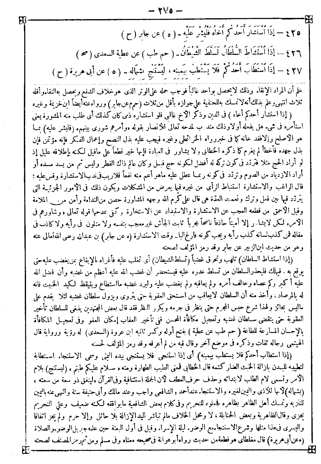 425 - (إذا استشار أحدكم أخاه) في الدين وذكر الأخ غالبي فلو استشاره ذمي كان كذلك أي طلب منه المشورة يعني استأمره في شيء هل يفعله أو لا وذلك مندوب لمدحه تعالى للأنصار بقوله {وأمرهم شورى بينهم} (فليشر عليه) بما هو الأصلح وإلا فقد خانه كما في خبر رواه الخرائطي وغيره فيجب عليه بذل النصح وإعمال الفكر فإنه مؤتمن فإن بذل جهده فأخطأ لم يغرم كما ذكره الخطابي ولا يشاور في العبادة فإنها خير قطعا على ما قيل لكنه بإطلاقه عليل إذ لو أراد الحج مثلا فتردد في كون تركه له أفضل لكونه حج قبل وكان عالم ذاك القطر وليس ثم من يسد مسده أو أراد الازدياد من الصوم وتردد في كونه ربما عطل عليه ما هو أعم منه نفعا فلا ريب في ندب الاستشارة وقس عليه قال الراغب: والاستشارة استنباط الرأي من غيره فيما يعرض من المشكلات ويكون ذلك في الأمور الجزئية التي يتردد فيها بين فعل وترك ونعمت العدة هي قال علي كرم الله وجهه المشاورة حصن من الندامة وأمن من الملامة وقيل الأحمق من قطعه العجب عن الاستشارة والاستبداد عن الاستخارة وكفى بمدحها قوله تعالى {وشاورهم في الأمر} لكن لا يشاور إلا أمينا حاذقا ناصحا مجربا ثابت الجأش غير معجب بنفسه ولا متلون في رأيه ولا كاذب في مقاله فمن كذب لسانه كذب رأيه ويجب كونه فارغ البال وقت الاستشارة