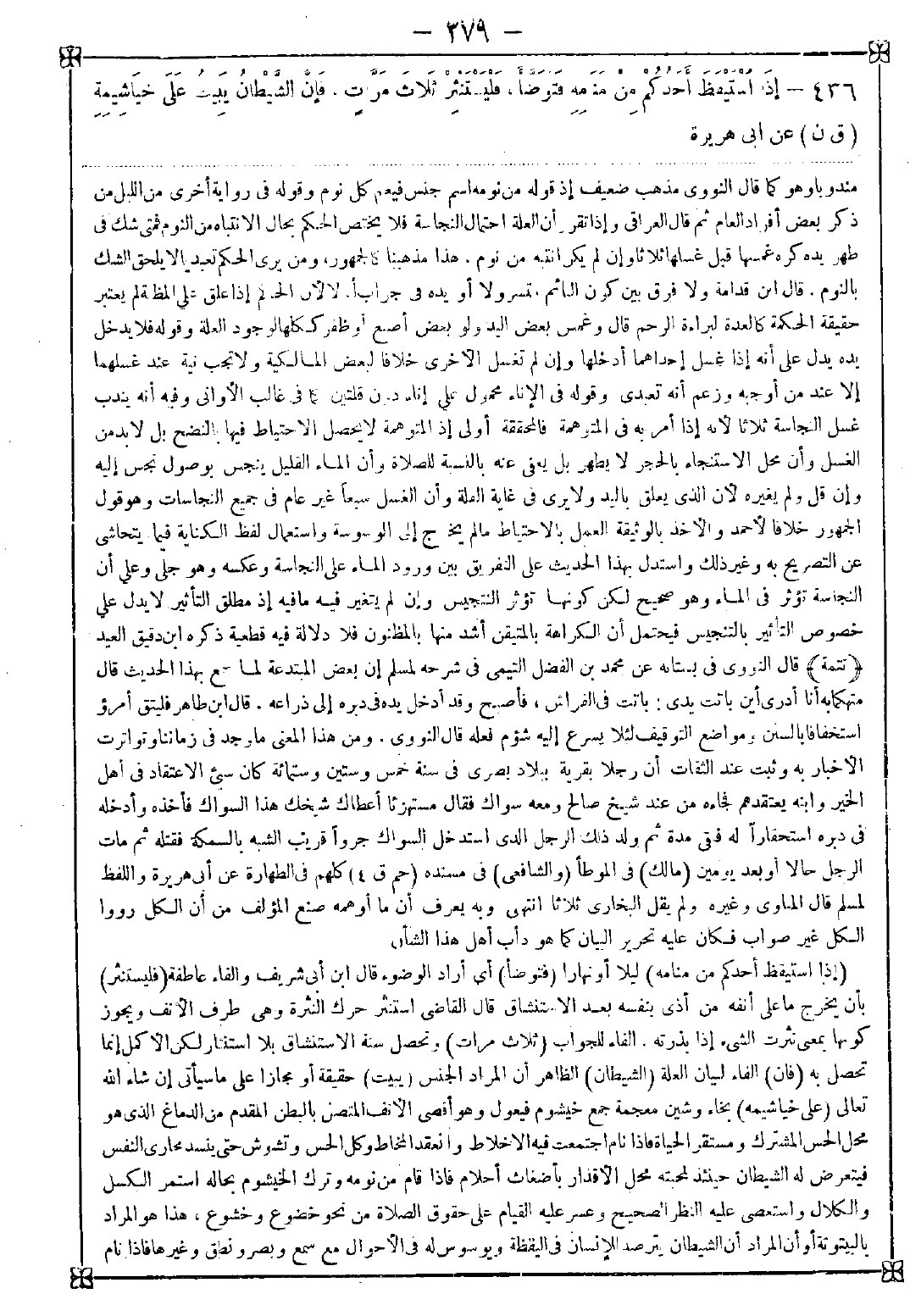 436 - (إذا استيقظ أحدكم من منامه) ليلا أو نهارا (فتوضأ) أي أراد الوضوء. قال ابن أبي شريف: والفاء عاطفة (فليستنثر) بأن يخرج ما على أنفه من أذى بنفسه بعد الاستنشاق. قال القاضي: استنثر حرك النثرة وهي طرف الأنف ويجوز كونها بمعنى نثرت الشيء إذا بذرته. والفاء للجواب (ثلاث مرات) وتحصل سنة الاستنشاق بلا استنثار لكن الأكمل إنما تحصل به (فإن) الفاء لبيان العلة (الشيطان) الظاهر أن المراد الجنس (يبيت) حقيقة أو مجازا على ما سيأتي إن شاء الله تعالى (على خياشيمه) بخاء وشين معجمة جمع خيشوم فيعول وهو أقصى الأنف المتصل بالبطن المقدم من الدماغ الذي هو محل الحس المشترك ومستقر الحياة فإذا نام اجتمعت فيه الأخلاط وانعقد المخاط وكل الحس وتشوش حتى ينسد مجاري النفس فيتعرض له الشيطان حينئذ لمحبته محل الأقذار بأضغاث أحلام فإذا قام من نومه وترك الخيشوم بحاله استمر الكسل والكلال واستعصى عليه النظر الصحيح وعسر عليه القيام على حقوق الصلاة من نحو خضوع وخشوع هذا هو المراد بالبيتوتة أو أن المراد أن الشيطان يترصد للإنسان في اليقظة ويوسوس له في الأحوال مع سمع وبصر ونطق وغيرها فإذا نام -[280]- انسدت تلك المنافذ إلا منفذ النفس من الخيشوم وهو باب مفتوح إلى قبة الدماغ فيبيت دون ذلك الباب وينفث بنفخه ونفثه في عالم الخيال ليريه من الأضغاث ما يكرهه فأرشد المصطفى صلى الله عليه وسلم أمته أن تمحو باستعمال الطهور على وجه التعبد آثار تلك النفحات والنفثات عن مجاري الأنفاس. وقال في البحر: خص الخيشوم لأن العين باب النظر إلى خلق السماوات والأرض فهو باب العبرة والفم باب الذكر والأذن باب سماع العلم والذكر وليس في الخيشوم شيء من هذه المعاني فكان محل مدخل الشيطان لبدن الإنسان للوسوسة <تنبيه> قال القاضي: هذه الفاآت الثلاث الأولى للعطف والثانية جواب الشرط دخل على الأمر والثالثة فاء السببية دخلت الجملة لتدل على أن ما بعده علة للأمر بالاستنثار