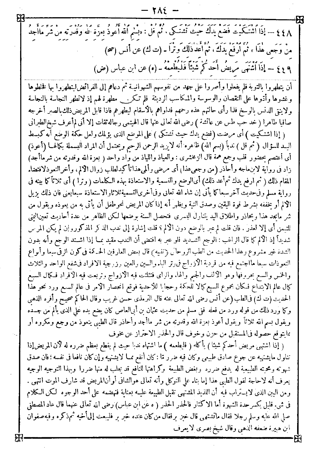 448 - (إذا اشتكيت) أي مرضت (فضع يدك حيث تشتكي) على الموضع الذي يؤلمك ولعل حكمة الوضع أنه كبسط اليد للسؤال (ثم قل) ندبا (بسم الله) ظاهره أنه لا يزيد الرحمن الرحيم ويحتمل أن المراد البسملة بكمالها (أعوذ) أي أعتصم بحضور قلب وجمع همة. قال الزمخشري: والعياذ واللياذ من واد واحد (بعزة الله وقدرته من شر ما أجد) زاد في رواية لابن ماجه وأحاذر (من وجعي هذا) أي مرضي وألمي هذا تأكيد لطلب زوال الألم وأخر التعوذ لاقتضاء المقام ذلك (ثم ارفع يدك ثم أعد ذلك) أي الوضع والتسمية والاستعاذة بهذه الكلمات (وترا) أي ثلاثا كما بينه في رواية مسلم وفي حديث آخر سبعا كما يأتي إن شاء الله تعالى وفي أخرى التسمية ثلاثا والاستعاذة سبعا يعني فإن ذلك يزيل الألم أو يخففه بشرط قوة اليقين وصدق النية ويظهر أنه إذا كان المريض نحو طفل أن يأتي به من يعوذه ويقول من شر ما يجد هذا ويحاذر وإطلاق اليد يتناول اليسرى فتحصل السنة بوضعها لكن الظاهر من عدة أحاديث تعين اليمنى للتيمن أي إلا لعذر. فإن قلت لم عبر بالوضع دون الألم؟ قلت: إشارة إلى ندب الذكر المذكور وإن لم يكن المرض شديدا إذ الألم كما قال الراغب: الوجع الشديد فلو عبر به اقتضى أن الندب مقيد بما إذا اشتد الوجع وأنه بدون الشدة غير مشروع وهذا الحديث من الطب الروحاني <تنبيه> قال بعض العارفين الحكمة في كون الرقي سبعا وأنواع التعوذات سبعا ما اجتمع فيه من فردية الأزواج في وتر الباء والسين والعين وزوجية الأفراد في شفع الواحد والثلاث والخمس والسبع بحروفها وهو الألف والجيم والهاء والزاي فتثلثت فيه الأزواج وتربعت فيه الأفراد فكمال السبع كمال عالم الابتداع فكان مجموع السبع كمالا للحكمة وحجابا للأحدية فوقع انحصار الأمر في عالم السبع ورد نحو هذا الحديث