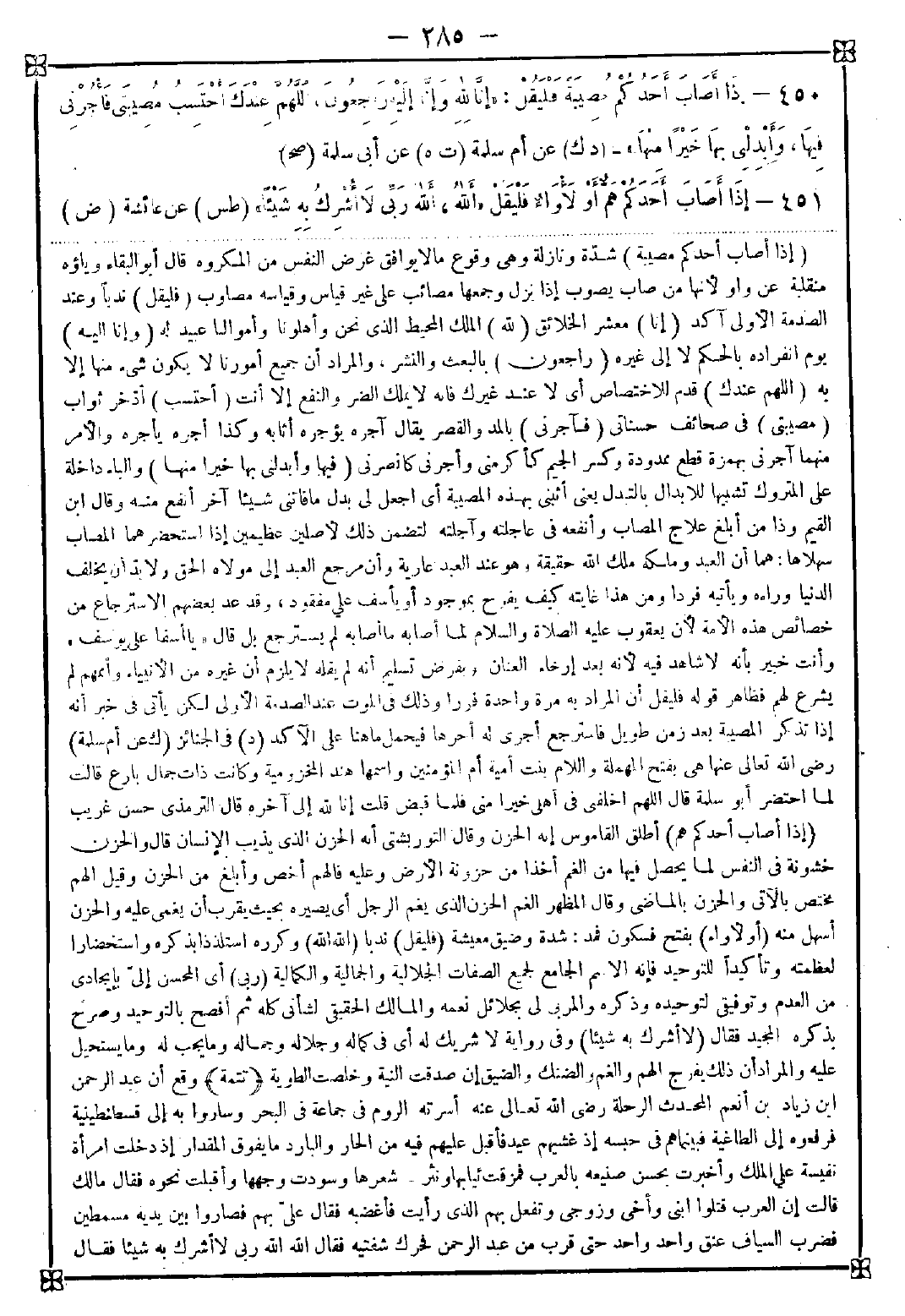 -[285]- 450 - (إذا أصاب أحدكم مصيبة) شدة ونازلة وهي وقوع ما لا يوافق غرض النفس من المكروه فال أبو البقاء: وياؤه منقلبة عن واو لأنها من صاب يصوب إذا نزل وجمعها مصائب على غير قياس وقياسه مصاوب (فليقل) ندبا وعند الصدمة الأولى آكد (إنا) معشر الخلائق (لله) الملك المحيط الذي نحن وأهلونا وأموالنا عبيد له (وإنا إليه) يوم انفراده بالحكم لا إلى غيره (راجعون) بالبعث والنشر والمراد أن جميع أمورنا لا يكون شيء منها إلا به (اللهم عندك) قدم للاختصاص أي لا عند غيرك فإنه لا يملك الضر والنفع إلا أنت (أحتسب) أدخر ثواب (مصيبتي) في صحائف حسناتي (فآجرني) بالمد والقصر يقال آجره يؤجره أثابه وكذا أجره يأجره والأمر منهما آجرني بهمزة قطع ممدودة وكسر الجيم كأكرمني وأجرني كأنصرني (فيها وأبدلني بها خيرا منها) والباء داخلة على المتروك تشبيها للابدال بالتبدل يعني أثبني بهذه المصيبة أي اجعل لي بدل ما فاتني شيئا آخر أنفع منه. وقال ابن القيم: وذا من أبلغ علاج المصاب وأنفعه في عاجلته وآجلته لتضمن ذلك لأصلين عظيمين إذا استحضرهما المصاب سهلاها: هما أن العبد وملكه ملك الله حقيقة وهو عند العبد عارية وأن مرجع العبد إلى مولاه الحق ولا بد أن يخلف الدنيا وراءه ويأتيه فردا ومن هذا غايته كيف يفرح بموجود أو يأسف على مفقود وقد عد بعضهم الاسترجاع من خصائص هذه الأمة لأن يعقوب عليه الصلاة والسلام لما أصابه ما أصابه لم يسترجع بل قال {يا أسفا على يوسف} وأنت خبير بأنه لا شاهد فيه لأنه بعد إرخاء العنان وفرض تسليم أنه لم يقله لا يلزم أن غيره من الأنبياء وأممهم لم يشرع لهم فظاهر قوله فليقل أن المراد به مرة واحدة فورا وذلك في الموت عند الصدمة الأولى لكن يأتي في خبر أنه إذا تذكر المصيبة بعد زمن طويل فاسترجع أجرى له أجرها فيحمل ما هنا على الآكد