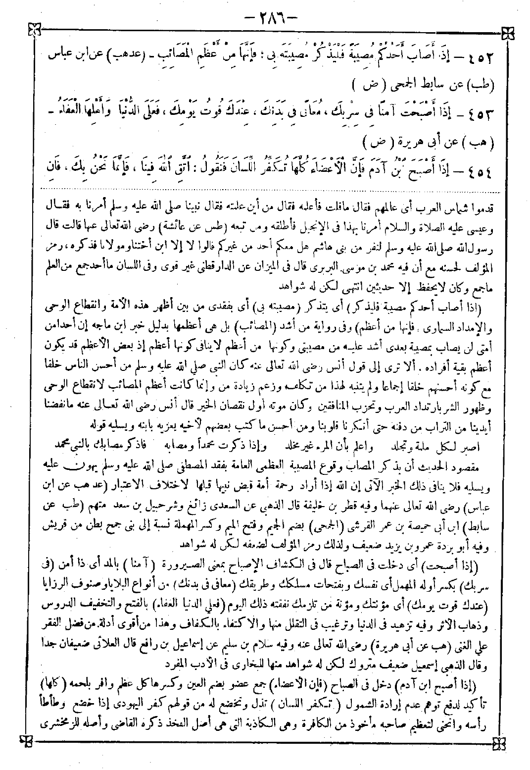 452 - (إذا أصاب أحدكم مصيبة فليذكر) أي يتذكر (مصيبته بي) أي بفقدي من بين أظهر هذه الأمة وانقطاع الوحي والإمداد السماوي (فإنها من أعظم) وفي رواية من أشد (المصائب) بل هي أعظمها بدليل خبر ابن ماجه إن أحدا من أمتي لن يصاب بمصيبة بعدي أشد عليه من مصيبتي وكونها من أعظم لا ينافي كونها أعظم إذ بعض الأعظم قد يكون أعظم بقية أفراده. ألا ترى إلى قول أنس رضي الله تعالى عنه كان النبي صلى الله عليه وسلم من أحسن الناس خلقا مع كونه أحسنهم خلقا إجماعا ولم ينتبه لهذا من تكلف وزعم زيادة من وإنما كانت أعظم المصائب لانقطاع الوحي وظهور الشر بارتداد العرب وتحزب المنافقين وكان موته أول نقصان الخير قال أنس رضي الله تعالى عنه ما نفضنا أيدينا من التراب من دفنه حتى أنكرنا قلوبنا ومن أحسن ما كتب بعضهم لأخيه يعزيه بابنه ويسليه قوله: