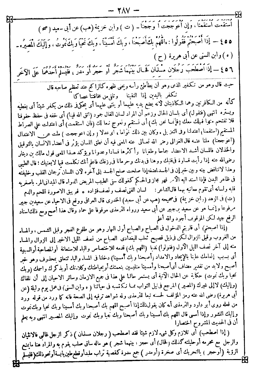 455 - (إذا أصبحتم) أي قاربتم الدخول في الصباح والصباح أول النهار وهو من طلوع الفجر وقبل الشمس والمساء من الغروب وقبل الزوال لكن في ذيل فصيح ثعلب للبغدادي الصباح من نصف الليل الأخير إلى الزوال والمساء منه إلى آخر نصف الليل الأول (فقولوا) ندبا (اللهم بك) قدمه للاختصاص والباء للاستعانة أو المصاحبة أو السببية أي بسبب إنعامك علينا بالإيجاد والإمداد (أصبحنا وبك أمسينا) دخلنا في المساء والباء تتعلق بمحذوف وهو خبر أصبح ولا بد من تقدير مضاف أي أصبحنا وأمسينا متلبسين بنعمتك أو بحياطتك وكلاءتك أو بذكرك واسمك (وبك نحيا وبك نموت) حكاية عن الحال الآتية أي يستمر حالنا على هذا في جميع الأزمان وسائر الأحيان إلى أن نلقاك (وإليك) لا إلى غيرك (المصير) المرجع في نيل الثواب مما نكتسبه في حياتنا