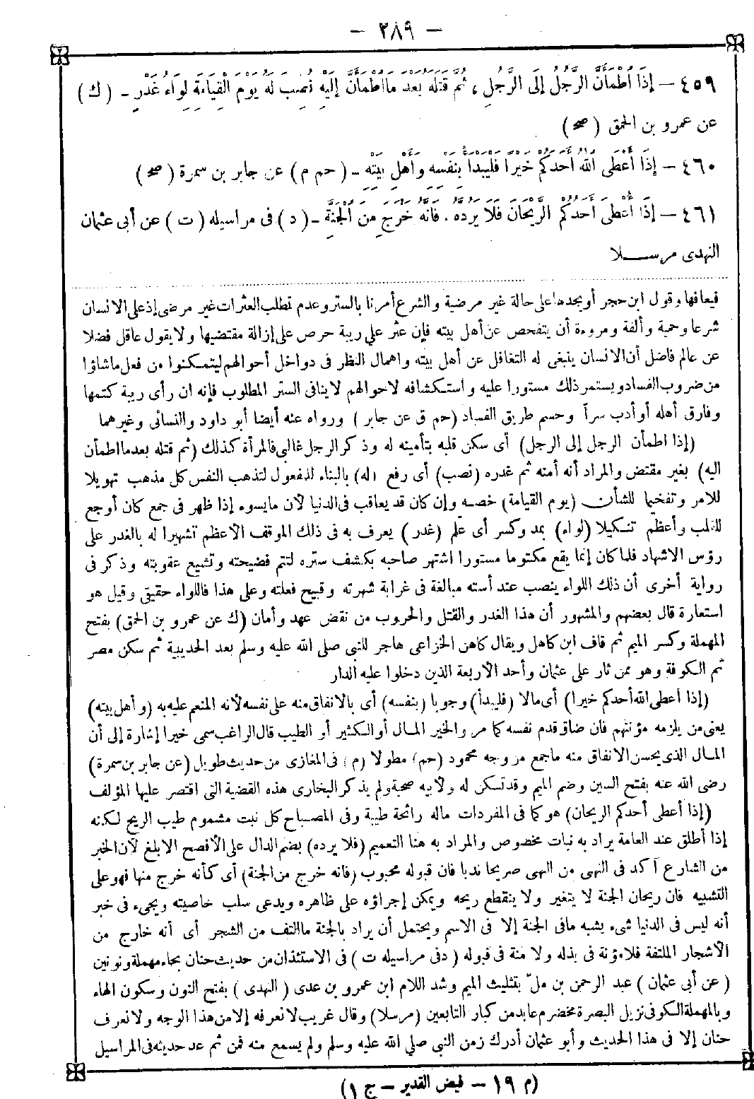 460 - (إذا أعطى الله أحدكم خيرا) أي مالا (فليبدأ) وجوبا (بنفسه) أي بالإنفاق منه على نفسه لأنه المنعم عليه به (وأهل بيته) يعني من يلزمه مؤنتهم فإن ضاق قدم نفسه كما مر والخير المال أو الكثير أو الطيب قال الراغب: سمي خيرا إشارة إلى أن المال الذي يحسن الإنفاق منه ما جمع من وجه محمود