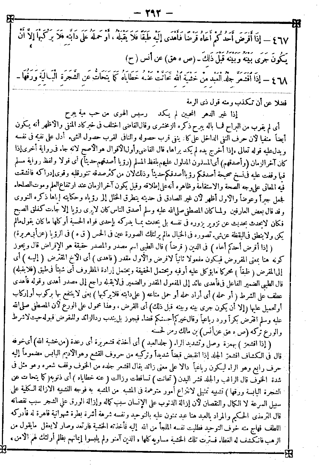 467 - (إذا أقرض أحدكم أخاه) في الدين (قرضا) قال الطيبي: اسم مصدر والمصدر حقيقة هو الإقراض قال ويجوز كونه هنا بمعنى المقروض فيكون مفعولا ثانيا لا قرض والأول مقدر (فأهدى) أي الأخ المقترض (إليه) أي إلى المقرض (طبقا) محركا ما يؤكل عليه أو فيه ويحتمل الحقيقة ويحتمل إرادة المظروف أي شيئا في طبق (فلا يقبله) قال الطيبي: الضمير الفاعل في فأهدى عائد إلى المفعول المقدر والضمير في لا يقبله راجع إلى مصدر أهدى وقوله فأهدى عطف على الشرط (أو حمله) أي أراد حمله أو حمل متاعه (على دابته فلا يركبها) يعني لا ينتفع بها بركوب أو إركاب أو تحميل عليها (إلا أن يكون جرى بينه وبينه قبل ذلك) أي القرض وهذا محمول على الورع لأن المصطفى صلى الله عليه وسلم اقترض بكرا ورد رباعيا وقال خيركم أحسنكم قضاء فيجوز بل يندب رد الزائد وللمقرض قبوله حيث لا شرط والورع تركه