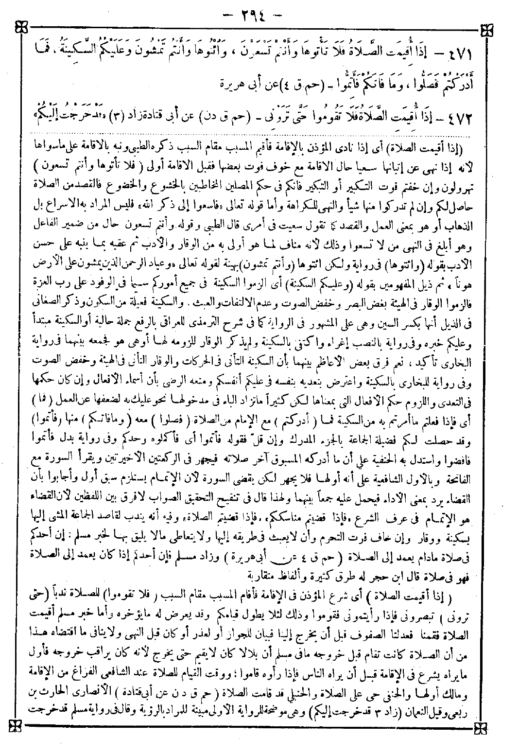 -[294]- 471 - (إذا أقيمت الصلاة) أي إذا نادى المؤذن بالإقامة فأقيم المسبب مقام السبب ذكره الطيبي. ونبه بالإقامة على ما سواها لأنه إذا نهى عن إتيانها سعيا حال الإقامة مع خوف فوت بعضها فقبل الإقامة أولى (فلا تأتوها وأنتم تسعون) تهرولون وإن خفتم فوت التكبير أو التبكير فإنكم في حكم المصلين المخاطبين بالخشوع والخضوع فالقصد من الصلاة حاصل لكم وإن لم تدركوا منها شيئا والنهي للكراهة وأما قوله تعالى {فاسعوا إلى ذكر الله} فليس المراد به الاسراع بل الذهاب أو هو بمعنى العمل والقصد كما تقول سعيت في أمري. قال الطيبي: وقوله وأنتم تسعون حال من ضمير الفاعل وهو أبلغ في النهي من لا تسعوا وذلك لأنه مناف لما هو أولى به من الوقار والأدب ثم عقبه بما ينبه على حسن الأدب بقوله (وائتوها) في رواية ولكن ائتوها (وأنتم تمشون) بهينة لقوله تعالى {وعباد الرحمن الذين يمشون على الأرض هونا} ثم ذيل المفهومين بقوله (وعليكم السكينة) أي الزموا السكينة في جميع أموركم سيما في الوفود على رب العزة فالزموا الوقار في الهيئة بغض البصر وخفض الصوت وعدم الالتفات والعبث. والسكينة فعيلة من السكون وذكر الصغاني في الذيل أنها بكسر السين وهي على المشهور في الرواية كما في شرح الترمذي للعراقي بالرفع جملة حالية أو السكينة مبتدأ وعليكم خبره وفي رواية بالنصب إغراء واكتفى بالسكينة ولم يذكر الوقار للزومه لها أو هي هو فجمعه بينهما في رواية البخاري تأكيد نعم فرق بعض الأعاظم بينهما بأن السكينة التأني في الحركات والوقار التأني في الهيئة وخفض الصوت وفي رواية للبخاري بالسكينة واعترض بتعديه بنفسه في عليكم أنفسكم ومنعه الرضي بأن أسماء الأفعال وإن كان حكمها في التعدي واللزوم حكم الأفعال التي بمعناها لكن كثيرا ما تزاد الباء في مدخولها نحو عليك به لضعفها عن العمل (فما) أي فإذا فعلتم ما أمرتم به من السكينة فما (أدركتم) مع الإمام من الصلاة (فصلوا) معه (وما فاتكم) منها (فأتموا) وقد حصلت لكم فضيلة الجماعة بالجزء المدرك وإن قل فقوله فأتموا أي فأكملوه وحدكم وفي رواية بدل فأتموا فاقضوا واستدل به الحنفية على أن ما أدركه المسبوق آخر صلاته فيجهر في الركعتين الأخيرتين ويقرأ السورة مع الفاتحة وبالأول الشافعية على أنه أولها فلا يجهر لكن يقضي السورة لأن الإتمام يستلزم سبق أول وأجابوا بأن القضاء يرد بمعنى الأداء فيحمل عليه جمعا بينهما ولهذا قال في تنقيح التحقيق: الصواب لا فرق بين اللفظين لأن القضاء هو الإتمام في عرف الشرع {فإذا قضيتم مناسككم} {فإذا قضيتم الصلاة} وفيه أنه يندب لقاصد الجماعة المشي إليها بسكينة ووقار وإن خاف فوت التحريم وأن لا يعبث في طريقه إليها ولا يتعاطى ما لا يليق بها لخبر مسلم: إن أحدكم في صلاة ما دام يعمد إلى الصلاة