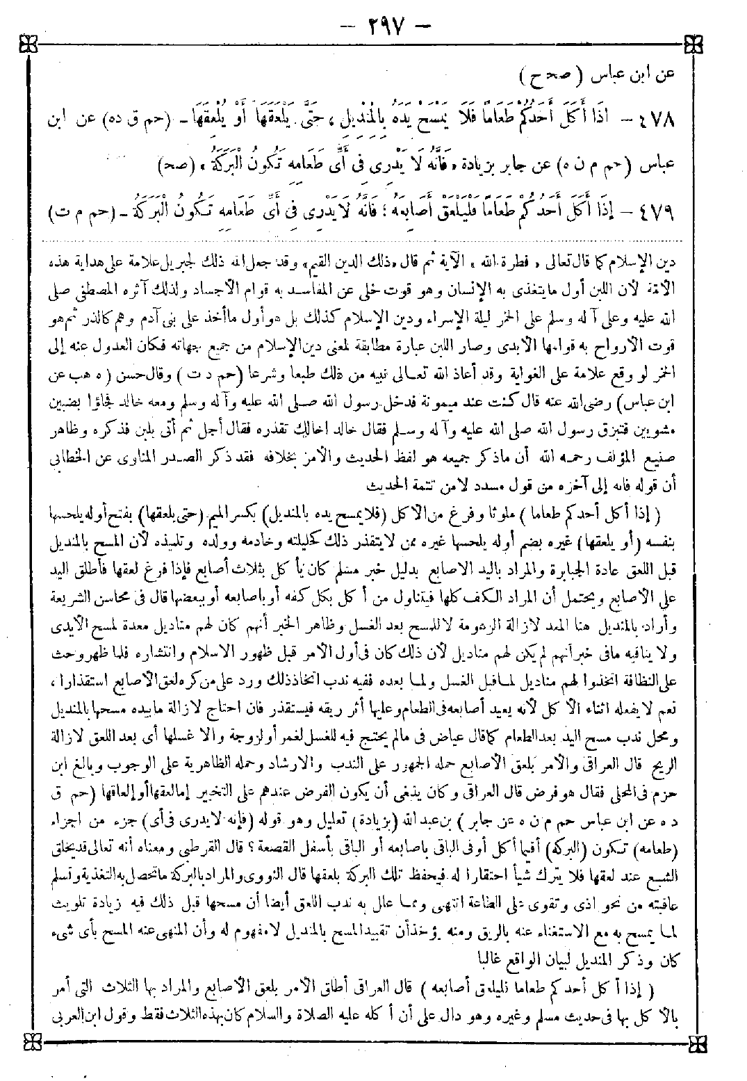 479 - (إذا أكل أحدكم طعاما فليلعق أصابعه) قال العراقي: أطلق الأمر بلعق الأصابع والمراد بها الثلاث التي أمر بالأكل بها في حديث مسلم وغيره وهو دال على أن أكله عليه الصلاة والسلام كان بهذه الثلاث فقط وقول ابن العربي: -[298]- إن شاء أحد أن يأكل بخمس فليأكل فقد كان المصطفى صلى الله عليه وسلم يتعرق العظم وينهش اللحم ولا يمكن ذلك عادة إلا بخمس غير قويم إذ لا يسلم أنه لا يمكن تعرق العظم ونهش اللحم إلا بالكل بل يمكن بثلاث وبفرض عدم إمكانه ليس هذا أكلا بكل الأصابع بل هو مسك بالأصابع فقط لا أكل بها وتقدير كونه أكل بها فهل محل ضرورة كمن لا يمين له فأكل بشماله انتهى وفي خبر الطبراني كان يأكل بأصابعه الثلاث بالإبهام والتي تليها والوسطى ثم رأيته يلعق الثلاث قبل أن يمسحها الوسطى ثم التي تليها ثم الإبهام. قال المؤلف في شرح الترمذي: والوسطى تكون مثالا فيبقى فيها الطعام أكثر ولأنها لطولها أول ما ينزل فيه ويحتمل أن الذي يلعق يكون بطن كفه إلى جهة وجهه فإذا ابتدأ بالوسطى انتقل إلى السبابة على جهة يمينه ثم الإبهام (فإنه لا يدري في أي طعامه تكون البركة) أي ما يحصل به التغذي ويقوى به على الطاعة كما تقرر ومنه أخذ أن الكلام فيما يحل تناوله وذكر اسم الله عليه قيل وقد يراد بالبركة صلاحية كون الطعام بصفة صالحة للإنسانية