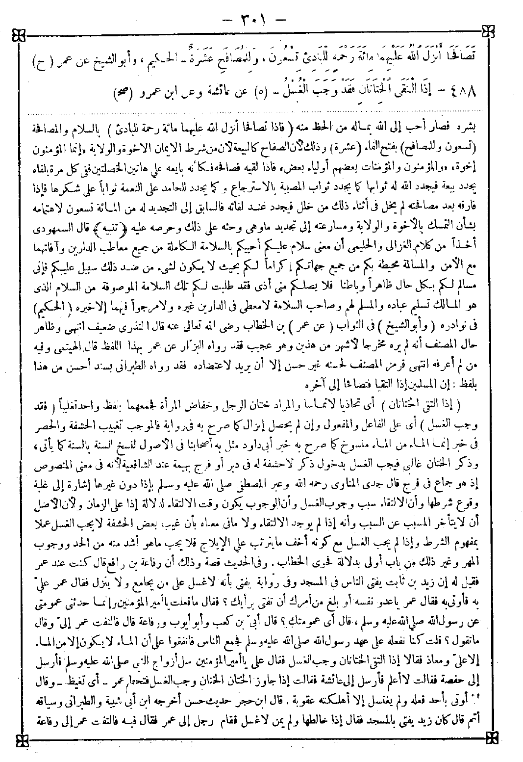 488 - (إذا التقى الختانان) أي تحاذيا لا تماسا والمراد ختان الرجل وخفاض المرأة فجمعهما بلفظ واحد تغليبا (فقد وجب الغسل) أي على الفاعل والمفعول وإن لم يحصل إنزال كما صرح به في رواية فالموجب تغييب الحشفة والحصر في خبر إنما الماء من الماء منسوخ كما صرح به خبر أبي داود مثل به أصحابنا في الأصول لنسخ السنة بالسنة كما يأتي وذكر الختان غالبي فيجب الغسل بدخول ذكر لا حشفة له في دبر أو فرج بهيمة عند الشافعي لأنه في معنى المنصوص إذ هو جماع في فرج قال جدي المناوي رحمه الله: وعبر المصطفى صلى الله عليه وسلم بإذا دون غيرها إشارة إلى غلبة وقوع شرطها وأن الالتقاء سبب وجوب الغسل وأن الوجوب يكون وقت الالتقاء لدلالة إذا على الزمان ولأن الأصل أن لا يتأخر المسبب عن السبب وأنه إذا لم يوجد الالتقاء ولا في معناه بأن غيب بعض الحشفة لا يجب الغسل عملا بمفهوم الشرط وإذا لم يجب الغسل مع كونه أخف ما يترتب على الإيلاج فلا يجب ما هو أشد منه من الحد ووجوب المهر وغير ذلك من باب أولى بدلالة فحوى الخطاب. وفي الحديث قصة وذلك أن رفاعة بن رافع قال: كنت عند عمر فقيل له إن زيد بن ثابت يفتي الناس في المسجد وفي رواية يفتي بأنه لا غسل على من يجامع ولا ينزل. فقال عمر: علي به فأوتي به فقال عمر: يا عدو نفسه أو بلغ من أمرك أن تفتي برأيك؟ فقال: ما فعلت يا أمير المؤمنين وإنما حدثني عمومتي عن رسول الله صلى الله عليه وسلم قال: أي عمومتك؟ قال: أبي بن كعب وأبو أيوب ورفاعة قال: فالتفت عمر إلي وقال: ما تقول؟ قلت: كنا نفعله على عهد رسول الله صلى الله عليه وسلم فجمع الناس فاتفقوا على أن الماء لا يكون إلا من الماء إلا علي ومعاذ فقالا إذا التقى الختانان وجب الغسل فقال علي: يا أمير المؤمنين سل أزواج النبي صلى الله عليه وسلم فأرسل إلى حفصة فقالت: لا أعلم فأرسل إلى عائشة فقالت: إذا جاوز الختان الختان وجب الغسل فتحطم عمر - أي تغلظ - وقال: لا أوتى بأحد فعله ولم يغتسل إلا أهلكته عقوبة. قال ابن حجر: حديث حسن أخرجه ابن أبي شيبة والطبراني وسياقه أتم قال: كان زيد يفتي بالمسجد فقال: إذا خالطها ولم يمن لا غسل فقام رجل إلى عمر فقال فيه فالتفت عمر إلى رفاعة -[302]- وقال فيه بعد قول علي ومعاذ قد اختلفتم وأنتم أهل بدر إلى آخره