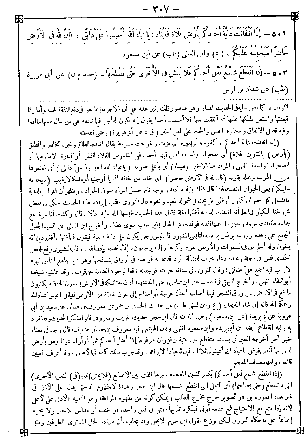 501 - (إذا انفلتت دابة أحدكم) كفرسه أو بعيره أي فرت وخرجت مسرعة يقال انفلت الطائر وغيره تخلص وانطلق (بأرض) بالتنوين (فلاة) أي صحراء واسعة ليس فيها أحد. ففي القاموس الفلاة القفر أو المفازة لا ماء فيها أو الصحراء الواسعة انتهى والمراد هنا الأخير (فليناد) أي بأعلى صوته (يا عباد الله احبسوا علي دابتي) أي امنعوها من الهرب وعلله بقوله (فإن لله في الأرض حاضرا) أي خلقا من خلقه إنسيا أو جنيا أو ملكا لا يغيب (سيحبسه عليكم) يعني الحيوان المنفلت فإذا قال ذلك بنية صادقة وتوجه تام حصل المراد بعون الجواد ويظهر أن المراد بالدابة ما يشمل كل حيوان كثور أو ظبي بل يحتمل شموله للعبد ونحوه قال النووي عقب إيراده هذا الحديث: حكى لي بعض شيوخنا الكبار في العلم أنه انفلتت له دابة أظنها بغلة فقال هذا الحديث فحبسها الله عليه حالا قال: وكنت أنا مرة مع جماعة فانفلتت بهيمة وعجزوا عنها فقلته فوقفت في الحال بغير سبب سوى هذا. وأخرج ابن السني عن السيد الجليل المجمع على زهده وورعه يونس بن عبيد التابعي المشهور قال: ليس رجل يكون على دابة صعبة فيقول في أذنها {أفغير دين الله يبغون وله أسلم من في السماوات والأرض طوعا وكرها وإليه يرجعون} إلا وقفت بإذن الله. وقال اقشيري وقع لجعفر الخلدي فص في دجلة وعنده دعاء مجرب للضالة ترد فدعا به فوجده في أوراق يتصفحها وهو: يا جامع الناس ليوم لا ريب فيه اجمع علي ضالتي وقال النووي في بستانه جربته فوجدته نافعا لوجود الضالة عن قرب وقد علمنيه شيخنا أبو البقاء انتهى. وأخرج البيهقي في الشعب عن ابن عباس رضي الله عنهما أن لله ملائكة في الأرض يسمون الحفظة يكتبون ما يقع في الأرض من ورق الشجر فإذا أصاب أحدكم عرجة أو احتياج إلى عون بفلاة من الأرض فليقل أعينوا عباد الله رحمكم الله فإنه إن شاء الله يعان