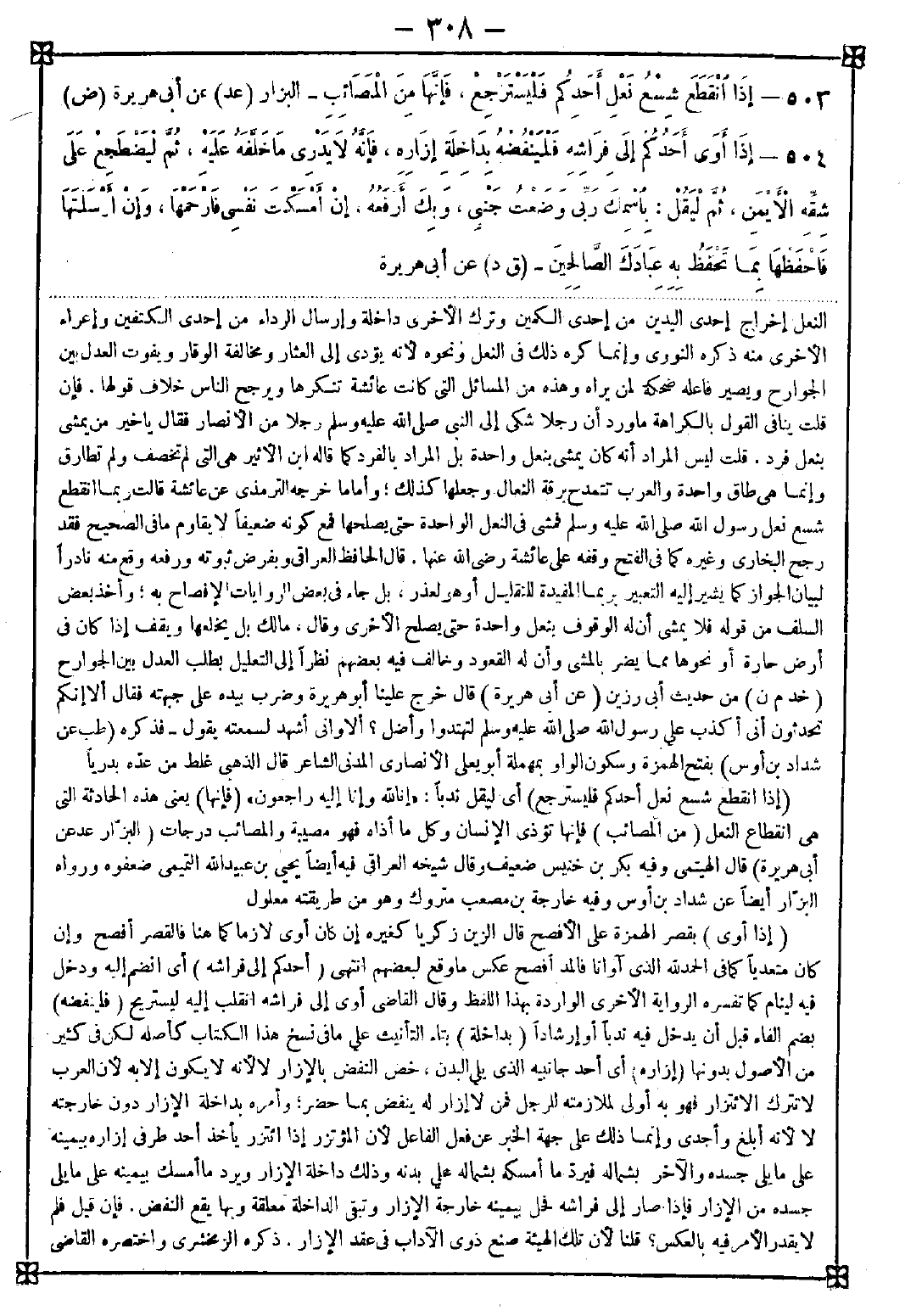 504 - (إذا أوى) بقصر الهمزة على الأفصح قال الزين زكريا كغيره إن كان أوى لازما كما هنا فالقصر أفصح وإن كان متعديا كما في الحمد لله الذي آوانا فالمد أفصح عكس ما وقع لبعضهم انتهى. (أحدكم إلى فراشه) أي انضم إليه ودخل فيه لينام كما تفسره الرواية الأخرى الواردة بهذا اللفظ وقال القاضي: أوى إلى فراشه انقلب إليه ليستريح (فلينفضه) بضم الفاء قبل أن يدخل فيه ندبا وإرشادا (بداخلة) بتاء التأنيث على ما في نسخ هذا الكتاب كأصله لكن في كثير من الأصول بدونها (إزاره) أي أحد جانبيه الذي يلي البدن خص النفض بالإزار لا لأنه لا يكون إلا به لأن العرب لا تترك الائتزار فهو به أولى لملازمته للرجل فمن لا إزار له ينفض بما حضر وأمره بداخلة الإزار دون خارجته لا لأنه أبلغ وأجدى وإنما ذلك على جهة الخبر عن فعل الفاعل لأن المؤتزر إذا ائتزر يأخذ أحد طرفي إزاره بيمينه على ما يلي جسده والآخر بشماله فيرد ما أمسكه بشماله على بدنه وذلك داخلة الإزار ويرد ما أمسك بيمينه على ما يلي جسده من الإزار فإذا صار إلى فراشه فحل ببمينه خارجة الإزار وتبقى الداخلة معلقة وبها يقع النفض. فإن قيل: فلم لا يقدر الأمر فيه بالعكس؟ قلنا: لأن تلك الهيئة صنع ذوي الآداب في عقد الإزار. ذكره الزمخشري واختصره القاضي -[309]- فقال: داخلة الإزار هي الحاشية التي تلي الجسد وتماسه وإنما أمرنا بالنفض بها لأن المتحول إلى فراشه يحل بيمينه خارجة إزاره وتبقى الداخلة معلقة فينفض بها وروى بصنفة إزاره بكسر النون وهو جانبه الذي لا هدب له وهو موافق لما ذكر (فإنه لا) وفي رواية ما (يدري ما خلفه) بالتشديد وبالتخفيف. قال الزمخشري: ما مبتدأ ويدري معلق عنه لتضمنه معنى الاستفهام (عليه) أي على الفراش يعني لا يدري ما حصل في فراشه بعد خروجه منه إلى عوده من قذر وهوام مؤذية (ثم ليضطجع) ندبا و (على شقه الأيمن) أولى (ثم ليقل) ندبا (باسمك ربي وضعت جنبي وبك أرفعه) أي بك أستعين على وضع جنبي ورفعه فالباء للاستعانة وقد استدل جمع متأخرون به على أن متعلق البسملة يقدر فعلا مؤخرا مناسبا لما جعلت التسمية مبدأ كما جنح إليه الكشاف وفيه إشعار بأنه لا يقول إن شاء الله إذ لو شرعت المشيئة هنا لذكرها فالاقتصار على الوارد أولى ذكره السبكي (إن أمسكت نفسي) أي قبضت روحي في نومي (فارحمها) وفي رواية البخاري فاغفر لها (وإن أرسلتها) أي رددت الحياة لي وأيقظتني من النوم (فاحفظها) إشارة إلى آية {الله يتوفى الأنفس حين موتها} (بما) أي بالذي (تحفظ به عبادك الصالحين) أي القائمين بحقوقك. وذكر المغفرة للميت والحفظ عند الإرسال لمناسبته له والتاء في بما تحفظ مثلها في كتبت بالقلم وما موصولة مبهة وبيانها ما دل عليه صلتها لأنه تعالى إنما يحفظ عباده الصالحين من المعاصي وأن لا يهنوا في طاعته بتوفيقه وفيه ندب هذه الأذكار عند الأوي إلى الفراش ليكون نومه على ذكر وتختم يقظته بعبادة