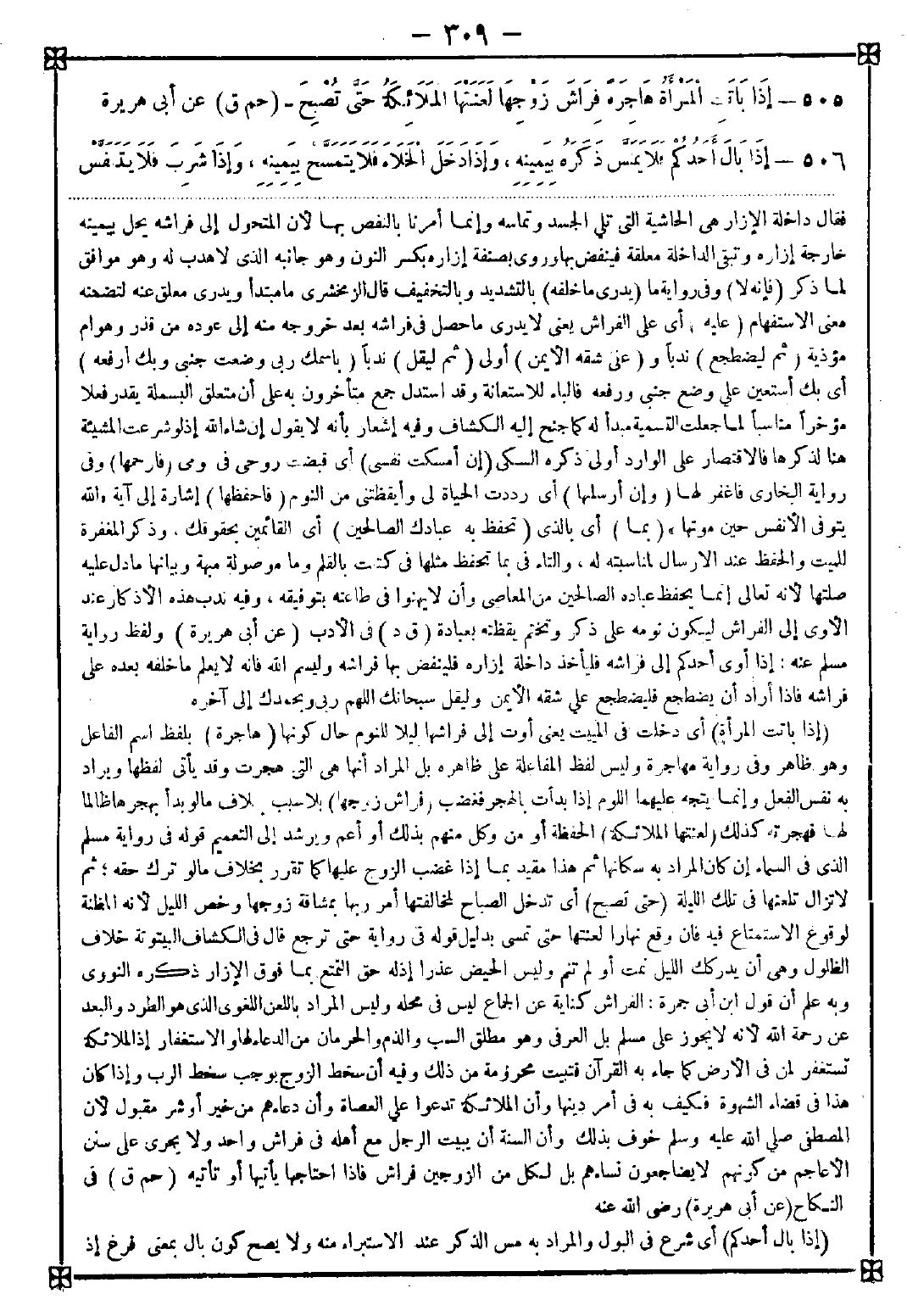 505 - (إذا باتت المرأة) أي دخلت في المبيت يعني أوت إلى فراشها ليلا للنوم حال كونها (هاجرة) بلفظ اسم الفاعل وهو ظاهر وفي رواية مهاجرة وليس لفظ المفاعلة على ظاهره بل المراد أنها هي التي هجرت وقد يأتي لفظها ويراد به نفس الفعل وإنما يتجه عليها اللوم إذا بدأت بالهجر فغضب (فراش زوجها) بلا سبب بخلاف ما لو بدأ بهجرها ظالما لها فهجرته كذلك (لعنتها الملائكة) الحفظة أو من وكل منهم بذلك أو أعم ويرشد إلى التعميم قوله في رواية مسلم الذي في السماء إن كان المراد به سكانها ثم هذا مقيد بما إذا غضب الزوج عليها كما تقرر بخلاف ما لو ترك حقه ثم لا تزال تلعنها في تلك الليلة (حتى تصبح) أي تدخل الصباح لمخالفتها أمر ربها بمشاقة زوجها وخص الليل لأنه المظنة لوقوع الاستمتاع فيه فإن وقع نهارا لعنتها حتى تمسي بدليل قوله في رواية حتى ترجع. قال في الكشاف: البيتوتة خلاف الظلول وهي أن يدركك الليل نمت أو لم تنم وليس الحيض عذرا إذ له حق التمتع بما فوق الإزار ذكره النووي وبه علم أن قول ابن أبي جمرة: الفراش كناية عن الجماع ليس في محله وليس المراد باللعن اللغوي الذي هو الطرد والبعد عن رحمة الله لأنه لا يجوز على مسلم بل العرفي وهو مطلق السب والذم والحرمان من الدعاء لها والاستغفار إذ الملائكة تستغفر لمن في الأرض كما جاء به القرآن فتبيت محرومة من ذلك وفيه أن سخط الزوج يوجب سخط الرب وإذا كان هذا في قضاء الشهوة فكيف به في أمر دينها وأن الملائكة تدعوا على العصاة وأن دعاءهم من خير أو شر مقبول لأن المصطفى صلى الله عليه وسلم خوف بذلك وأن السنة أن يبيت الرجل مع أهله في فراش واحد ولا يجري على سنن الأعاجم من كونهم لا يضاجعون نساءهم بل لكل من الزوجين فراش فإذا احتاجها يأتيها أو تأتيه