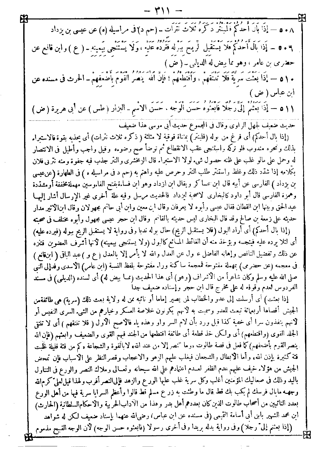 508 - (إذا بال أحدكم) أي فرغ من بوله (فلينتر) بمثناة فوقية لا مثلثة (ذكره ثلاث نترات) أي يجذبه بقوة فالاستبراء بذلك ونحوه مندوب فلو تركه واستنجى عقب الانقطاع ثم توضأ صح وضوءه وقيل واجب وأطيل في الانتصار له وحمل على ما لو غلب على ظنه حصول شيء لولا الاستبراء. قال الومخشري: والنتر جذب فيه جفوة ومنه نترني فلان بكلامه إذا شدد ذلك وغلظ واستنتر طلب النتر وحرص عليه واهتم به