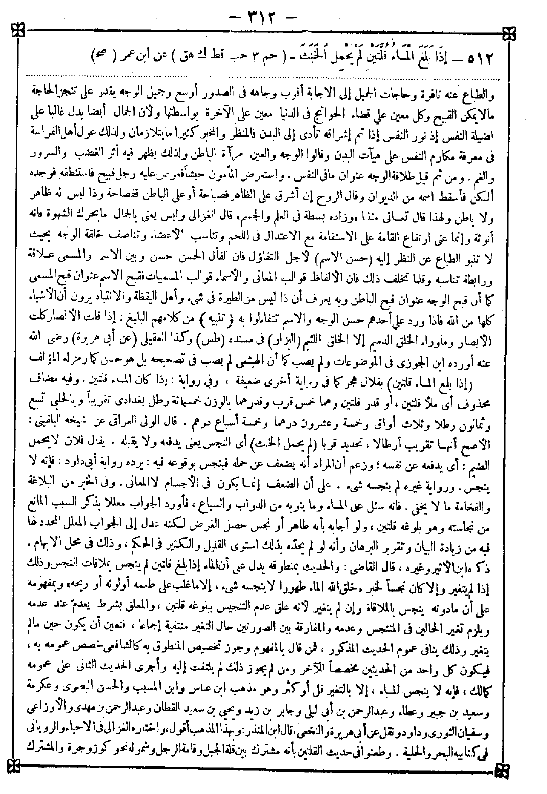 512 - (إذا بلغ الماء قلتين) بقلال هجر كما في رواية أخرى ضعيفة وفي رواية: إذا كان الماء قلتين. وفيه مضاف محذوف أي ملأ قلتين أو قدر قلتين وهما خمس قرب وقدرهما بالوزن خمس مئة رطل بغدادي تقريبا وبالحلبي تسع وثمانون رطلا وثلاث أواق وخمسة وعشرون درهما وخمسة أسباع درهم. قال الولي العراقي عن شيخه البلقيني: الأصح أنها تقريب أرطالا تحديد قربا (لم يحمل الخبث) أي النجس يعني يدفعه ولا يقبله. يقال: فلان لا يحمل الضيم أي يدفعه عن نفسه وزعم أن المراد أنه يضعف عن حمله فينجس بوقوعه فيه يرده رواية أي داود: فإنه لا ينجس. ورواية غيره لم ينجسه شيء. على أن الضعف إنما يكون في الأجسام لا المعاني. وفي الخبر من البلاغة والفخامة ما لا يخفى. فإنه سئل عن الماء وما ينوبه من الدواب والسباع فأورد الجواب معللا بذكر السبب المانع من نجاسته وهو بلوغه قلتين ولو أجابه بأنه طاهر أو نجس حصل الغرض لكنه عدل إلى الجواب المعلل المحدد لها فيه من زيادة البيان وتقرير البرهان وأنه لو لم يحده بذلك استوى القليل والكثير في الحكم وذلك في محل الابهام. ذكره ابن الأثير وغيره قال القاضي: والحديث بمنطوقه يدل على أن الماء إذا بلغ قلتين لم ينجس بملاقاة النجس وذلك إذا لم يتغير وإلا كان نجسا لخبر " خلق الله الماء لا ينجسه شيء إلا ما غلب على طعمه أو لونه أو ريحه " وبمفهومه على أن ما دونه ينجس بالملاقاة وإن لم يتغير لأنه علق عدم التنجيس ببلوغه قلتين والمعلق بشرط يعدم عند عدمه ويلزم تغير الحالين في المتنجس وعدمه والمفارقة بين الصورتين حال التغير منتفية إجماعا فتعين أن يكون حين ما لم يتغير وذلك ينافي عموم الحديث المذكور فمن قال بالمفهوم وجوز تخصيص المنطوق به كالشافعي خصص عمومه به فيكون كل واحد من الحديثين مخصصا للآخر ومن لم يجوز ذلك لم يلتفت إليه وأجرى الحديث الثاني على عمومه كمالك فإنه لا ينجس الماء إلا بالتغير قل أو كثر وهو مذهب ابن عباس وابن المسيب والحسن البصري وعكرمة وسعيد بن جبير وعطاء وعبد الرحمن بن أبي ليلى وجابر بن زيد ويحيى بن سعيد القطان وعبد الرحمن بن مهدي والأوزاعي وسفيان الثوري وداود ونقل عن أبي هريرة والنخعي قال ابن المنذر: وبهذا المذهب أقول واختاره الغزالي في الإحياء والروياني في كتابيه البحر والحلية. وطعنوا في حديث القلتين بأنه مشترك بين قلة الجبل وقامة الرجل وشموله نحو كوز وجرة والمشترك -[313]- لا يصح حدا ولأنه روي قلتان وثلاث وأربع فالأخذ بالقلتين ترجيح بلا مرجح رد الأول بأنه للآنية لأنه أشهر في الخطاب وأكثر عرفا والثاني بأنه لما قدر بعدد دل على أنه أكثرها. والثالث بأنه ورد من قلال هجر وهي تسع قربتين وشيئا فحمل الشيء على النصف احتياطا وخبر الثلاث والأربع على ما يقل باليد شك فيه الراوي ومعنى لم يحمل خبثا لم يقبله لقوله تعالى {حملوا التوراة ثم لم يحملوها} أي لم يقبلوها للعمل بها ولأنه روى " لا ينجس " فحمل " لم يحمل خبثا " على عدم قبول النجاسة جمعا ولأنه لولاه لم يكن لذكر القلتين وجه