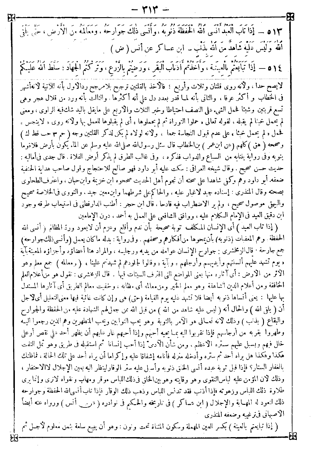 513 - (إذا تاب العبد) أي الإنسان المكلف توبة صحيحة بأن ندم وأقلع وعزم أن لا يعود ورد المظالم (أنسى الله الحفظة) وهم المعقبات (ذنوبه) بأن يمحوها من أفكارهم وصحفهم. وفي رواية: بدله ما كان يعمل (وأنسى ذلك جوارحه) جمع جارحة. قال الزمخشري: جوارح الإنسان عوامله من يديه ورجليه والمراد هنا أعضاؤه وأجزاؤه المعينة بآية {يوم تشهد عليهم ألسنتهم وأيديهم وأرجلهم} وبآية {وقالوا لجلودهم لم شهدتم علينا} (ومعالمه) جمع معلم وهو الأثر من الأرض: أي آثاره منها يعني المواضع التي اقترف السيئات فيها. قال الومخشري: تقول هو من أعلام العلم الخافقة ومن أعلام الدين الشاهقة وهو معلم الخير ومن معالمه أي مظانه وخفيت معالم الطريق أي آثارها المستدل بها عليها: يعني أنساها ذنوبه أيضا فلا تشهد عليه يوم القيامة (حتى) هي وإن كانت غائبة فيها معنى التعليل أي لأجل أن (يلقى الله) والحال أنه (ليس عليه شاهد من الله) من قبل الله ممن جعل لهم الشهادة عليه من الحفظة والجوارح والبقاع (بذنب) وذلك لأنه تعالى هو الآمر بالتوبة وهو يحب التوابين ويحب المتطهرين وهو الذين رجعوا إليه وطهروا بقربه من أرجاسهم فإذا تقربوا إليه بما يحبه أحبهم وإذا أحبهم غار عليهم أن يظهر أحد على نقص أو على خلل فيهم ويسبل عليهم ستره الأعظم ومن شأن الآدمي إذا أحب إنسانا ثم استقبله في طريق وهو ثمل التفت هكذا وهكذا هل يراه أحد ثم ستره وأدخله منزله فأنامه إشفاقا عليه وإكراما أن يراه أحد على تلك الحالة فما ظنك بالغفار الستار؟ فإذا قبل توبة عبده أنسى الخلق ذنوبه وسبل عليه ستر الوقار لينظر إليه بعين الإجلال لا الاحتقار وذلك لأن المؤمن عليه لباس التقوى وهو وقايته وهو بين الخلق في ذلك اللباس موقر ومهاب وتقواه لا ترى وإنما يرى طلاوة ذلك اللباس وزهوته فإذا أذنب فقد تدنس اللباس وذهب ذلك الوقار فإذا تاب أنسى الله الحفظة وجوارحه ذلك لتعود له المهابة والإجلال