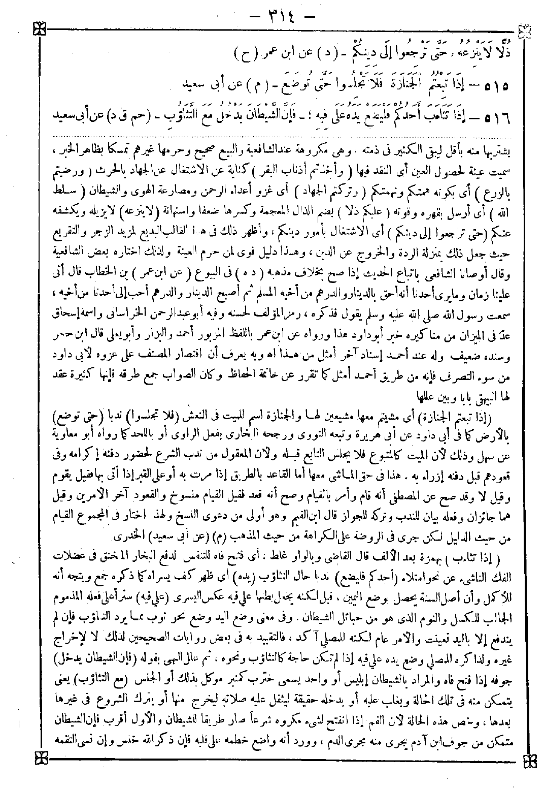 515 - (إذا تبعتم الجنازة) أي مشيتم معها مشيعين لها والجنازة اسم للميت في النعش (فلا تجلسوا) ندبا (حتى توضع) بالأرض كما في أبي داود عن أبي هريرة وتبعه النووي ورجحه البخاري بفعل الراوي أو باللحد كما رواه أبو معاوية عن سهل وذلك لأن الميت كالمتبوع فلا يجلس التابع قبله ولأن المعقول من ندب الشرع لحضور دفنه إكرامه وفي قعودهم قبل دفنه إزراء به. هذا في حق الماشي معها أما القاعد بالطريق إذا مرت به أو على القبر إذا أتي بها فقيل يقوم وقيل لا وقد صح عن المصطفى أنه قام وأمر بالقيام وصح أنه قعد فقيل القيام منسوخ والقعود آخر الأمرين وقيل هما جائزان وفعله بيان للندب وتركه للجواز قال ابن القيم وهو أولى من دعوى النسخ ولهذا اختار في المجموع القيام من حيث الدليل لكن جرى في الروضة على الكراهة من حيث المذهب