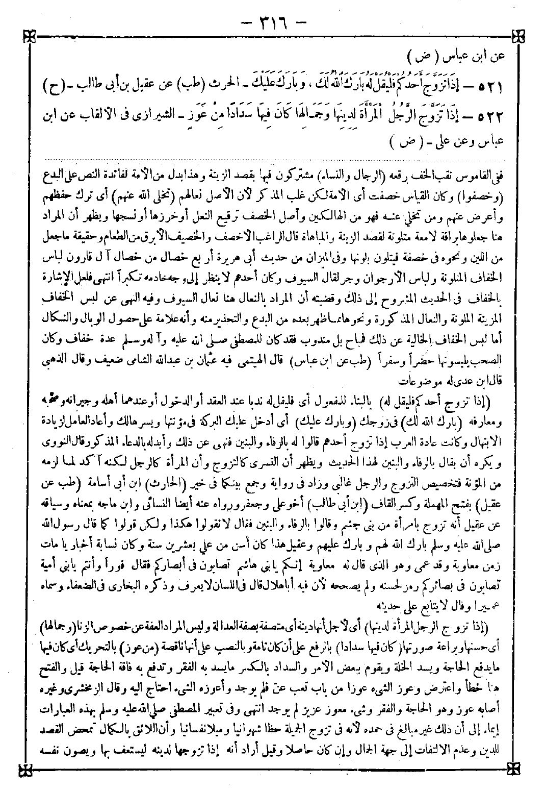 521 - (إذا تزوج أحدكم فليقل له) بالبناء للمفعول أي فليقل له ندبا عند العقد أو الدخول أو عندهما أهله وجيرانه وصحبه ومعارفه (بارك الله لك) في زوجك (وبارك عليك) أي أدخل عليك البركة في مؤنتها ويسرها لك وأعاد العامل لزيادة الابتهال وكانت عادة العرب إذا تزوج أحدهم قالوا له بالرفاء والبنين فنهى عن ذلك وأبدله بالدعاء المذكور. قال النووي: ويكره أن يقال بالرفاء والبنين لهذا الحديث ويظهر أن التسري كالتزوج وأن المرأة كالرجل لكنه آكد لما لزمه من المؤنة فتخصيص التزوج والرجل غالبي وزاد في رواية وجمع بينكما في خير