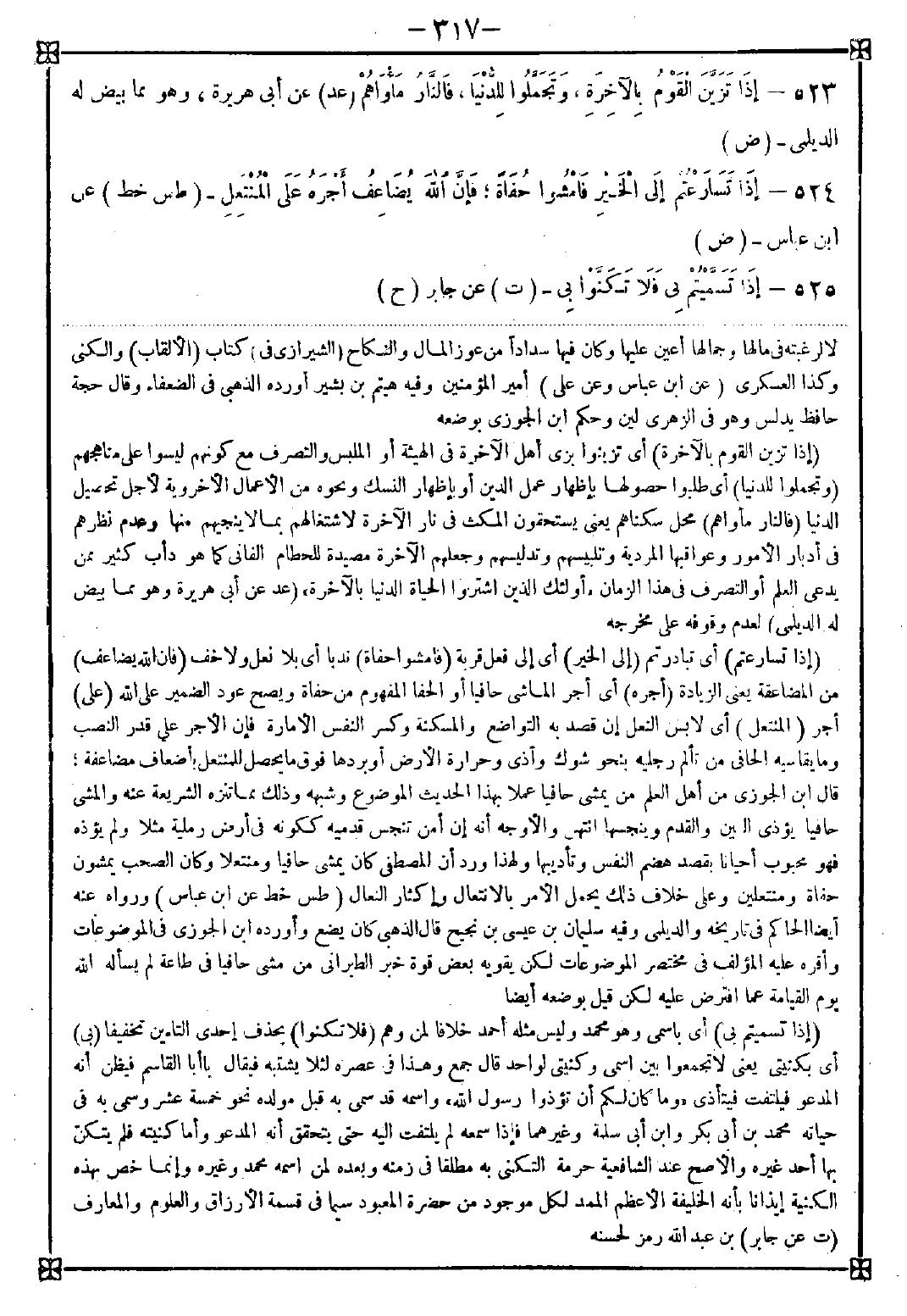 524 - (إذا تسارعتم) أي تبادرتم (إلى الخير) أي إلى فعل قربة (فامشوا حفاة) ندبا أي بلا نعل ولا خف (فإن الله يضاعف) من المضاعفة يعني الزيادة (أجره) أي أجر الماشي حافيا أو الحفا المفهوم من حفاة ويصح عود الضمير على الله (على) أجر (المنتعل) أي لابس النعل إن قصد به التواضع والمسكنة وكسر النفس الأمارة فإن الأجر على قدر النصب وما يقاسيه الحافي من تألم رجليه بنحو شوك وأذى وحرارة الأرض أو بردها فوق ما يحصل للمنتعل بأضعاف مضاعفة قال ابن الجوزي: من أهل العلم من يمشي حافيا عملا بهذا الحديث الموضوع وشبهه وذلك مما تنزه الشريعة عنه والمشي حافيا يؤذي العين والقدم وينجسها انتهى. والأوجه أنه إن أمن تنجس قدميه ككونه في أرض رملية مثلا ولم يؤذه فهو محبوب أحيانا بقصد هضم النفس وتأديبها ولهذا ورد أن المصطفى كان يمشي حافيا ومنتعلا وكان الصحب يمشون حفاة ومنتعلين وعلى خلاف ذلك يحمل الأمر بالانتعال وإكثار النعال