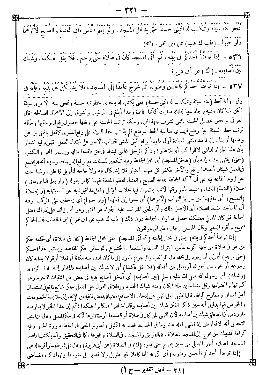 536 - (إذا توضأ أحدكم في بيته) يعني في محل إقامته (ثم أتى المسجد) يعني محل الجماعة (كان في صلاة) أي حكمه حكم من هو في صلاة من جهة كونه مأمورا بترك العبث واستعمال الخشوع وللوسائل حكم المقاصد ويستمر هذا الحكم (حتى يرجع) أي إلى أن يعود إلى محله. قال الراغب: والرجوع العود إلى ما كان البدء منه مكانا أو فعلا أو قولا بذاته كان رجوعه أو بجزء من أجزائه أو بفعل من أفعاله (فلا يقل هكذا) أي لا يشبك بين أصابعه فالمشار إليه قول الراوي (وشبك) أي رسول الله صلى الله عليه وسلم (بين أصابعه) أي أدخل أصابع يديه في بعض من اشتباك النجوم وهو كثرتها وانضمامها وكل متداخلين متشابكان ومنه شباك الحديد وإطلاق القول على الفعل جائز شائع ذائع في استعمال أهل اللسان ومطارح البلغاء قال الطيبي: لعل النهي عن إدخال الأصابع بعضها في بعض لما فيه من الإيماء إلى ملابسة الخصومات والخوض فيها بدليل أنه حين ذكر الفتن شبك بين أصابعه وقال اختلفوا فكانوا هكذا: ثم إن هذا الخبر لا يعارضه ما ورد من أن المصطفى شبك بين أصابعه لأن النهي لمن كان في صلاة أو قاصدها أو منتظرها لأنه في حكم المصلي وقال ابن المنير: التحقيق أنه لا تعارض إذ المنهي فعله عبثا وما في الحديث قصد به التمثيل وتصوير المعنى في اللفظ بصورة الحس وفيه كراهة تشبيك من خرج إلى المسجد للصلاة. في الطريق والمسجد في الصلاة وغيرها كما في التحقيق وأنه يكتب لقاصد المسجد لصلاة أجر المصلي من حين يخرج حتى يعود