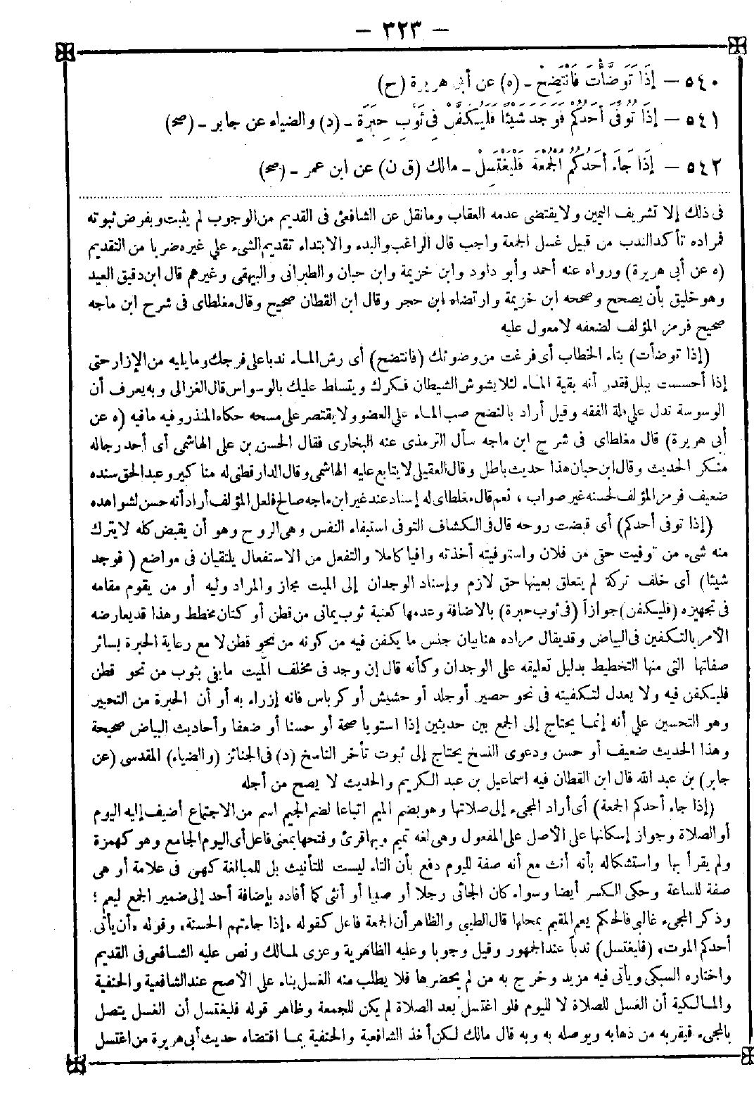 542 - (إذا جاء أحدكم الجمعة) أي أراد المجيء إلى صلاتها وهو بضم الميم اتباعا لضم الجيم اسم من الاجتماع أضيف إليه اليوم أو الصلاة وجواز إسكانها على الأصل على المفعول وهي لغة تميم وبها قرئ وفتحها بمعنى فاعل أي اليوم الجامع وهو كهمزة ولم يقرأ بها واستشكاله بأنه أنث مع أنه صفة لليوم دفع بأن التاء ليست للتأنيث بل للمبالغة كهي في علامة أو هي صفة للساعة وحكى الكسر أيضا وسواء كان الجائي رجلا أو صبيا أو أنثى كما أفاده بإضافة أحد إلى ضمير الجمع ليعم وذكر المجيء غالبي فالحكم يعم المقيم بمحلها. قال الطيبي: والظاهر أن الجمعة فاعل كقوله {إذا جاءتهم الحسنة} وقوله {أن يأتي أحدكم الموت} (فليغتسل) ندبا عند الجمهور وقيل وجوبا وعليه الظاهرية وعزى لمالك ونص عليه الشافعي في القديم واختاره السبكي ويأتي فيه مزيد وخرج به من لم يحضرها فلا يطلب منه الغسل بناء على الأصح عند الشافعية والحنفية والمالكية أن الغسل للصلاة لا لليوم فلو اغتسل بعد الصلاة لم يكن للجمعة وظاهر قوله فليغتسل أن الغسل يتصل بالمجيء فيقربه من ذهابه ويوصله به وبه قال مالك لكن أخذ الشافعية والحنفية بما اقتضاه حديث أبي هريرة من اغتسل -[324]- يوم الجمعة ثم راح أن الرواح متأخر عن الغسل فلو اغتسل بعد الفجر أجزأ عند الشافعية والحنفية لا المالكية لكن تقريبه من ذهابه أفضل عند الشافعي