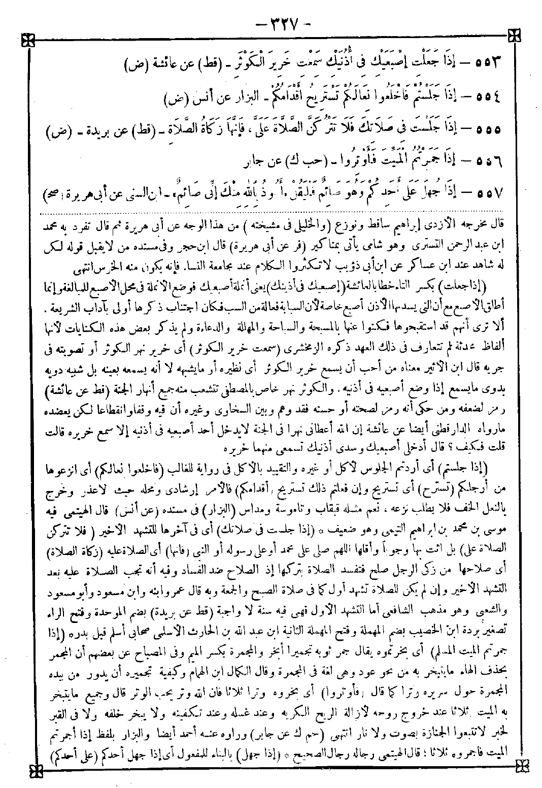 553 - (إذا جعلت) بكسر التاء خطابا لعائشة (إصبعيك (1) في أذنيك) يعني أنملة أصبعيك فوضع الأنملة في محل الأصبع للمبالغة وإنما أطلق الأصبع مع أن التي يسد بها الأذن أصبع خاصة لأن السبابة فعالة من السب فكان اجتناب ذكرها أولى بآداب الشريعة. ألا ترى أنهم قد استقبحوها فكنوا عنها بالمسبحة والسباحة والمهللة والدعاءة ولم يذكر بعض هذه الكنايات لأنها ألفاظ محدثة لم تتعارف في ذلك العهد ذكره الزمخشري (سمعت خرير الكوثر) أي خرير نهر الكوثر أو تصويته في جريه قال ابن الأثير معناه من أحب أن يسمع خرير الكوثر أي نظيره أو ما يشبهه لا أنه يسمعه بعينه بل شبيه دويه بدوي ما يسمع إذا وضع أصبعيه في أذنيه. والكوثر نهر خاص بالمصطفى تتشعب منه جميع أنهار الجنة