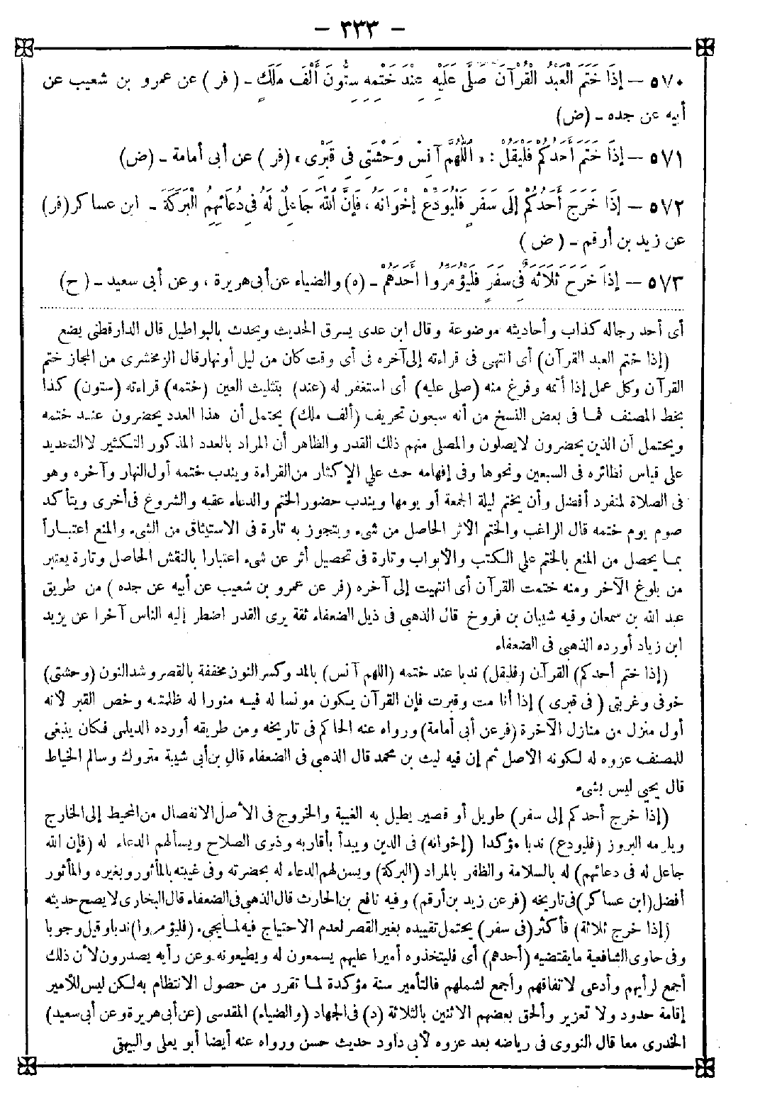 570 - (إذا ختم العبد القرآن) أي انتهى من قراءته في أي وقت كان من ليل أو نهار. قال الزمخشري: من المجاز ختم القرآن وكل عمل إذا أتمه وفرغ منه (صلى عليه) أي استغفر له (عند) بتثليث العين (ختمه) قراءته (ستون) كذا بخط المصنف فما في بعض النسخ من أنه سبعون تحريف (ألف ملك) يحتمل أن هذا العدد يحضرون عند ختمه ويحتمل أن الذين يحضرون لا يصلون والمصلي منهم ذلك القدر والظاهر أن المراد بالعدد المذكور التكثير لا التحديد على قياس نظائره في السبعين ونحوها وفي إفهامه حث على الإكثار من القراءة ويندب ختمه أول النهار وآخره وهو في الصلاة لمنفرد أفضل وأن يختم ليلة الجمعة أو يومها ويندب حضور الختم والدعاء عقبه والشروع في أخرى ويتأكد صوم يوم ختمه. قال الراغب: والختم الأثر الحاصل من شيء ويتجوز به تارة في الاستيثاق من الشيء والمنع اعتبارا بما يحصل من المنع بالختم على الكتب والأبواب وتارة في تحصيل أثر عن شيء اعتبارا بالنقش الحاصل وتارة يعتبر من بلوغ الآخر ومنه ختمت القرآن أي انتهيت إلى آخره