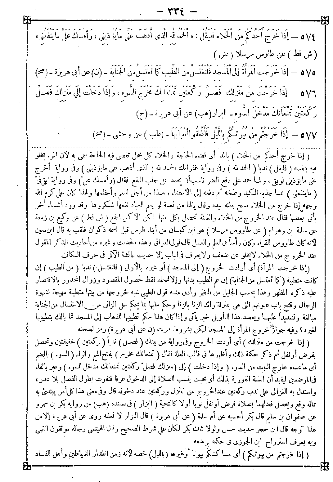 -[334]- 574 - (إذا خرج أحدكم من الخلاء) بالمد أي قضاء الحاجة والخلاء كل محل تقضي فيه الحاجة سمى به لأن المرء يخلو فيه بنفسه (فليقل) ندبا (الحمد لله) وفي رواية غفرانك الحمد لله (الذي أذهب عني ما يؤذيني) وفي رواية أخرج عني ما يؤذيني لو بقى ولما حمد على دفع الضر ناسب أن يحمد على جلب النفع فقال (وأمسك علي) وفي رواية أبقي في (ما ينفعني) مما جذبه الكبد وطبخه ثم دفعه إلى الأعضاء وهذا من أجل النعم وأعظمها ولهذا كان علي كرم الله وجهه إذا خرج من الخلاء مسح بطنه بيده وقال يا لها من نعمة لو يعلم العباد نفعها شكروها وقد ورد أشياء أخر يأتي بعضها فقال عند الخروج من الخلاء والسنة تحصل بكل منها لكن الأكمل الجمع