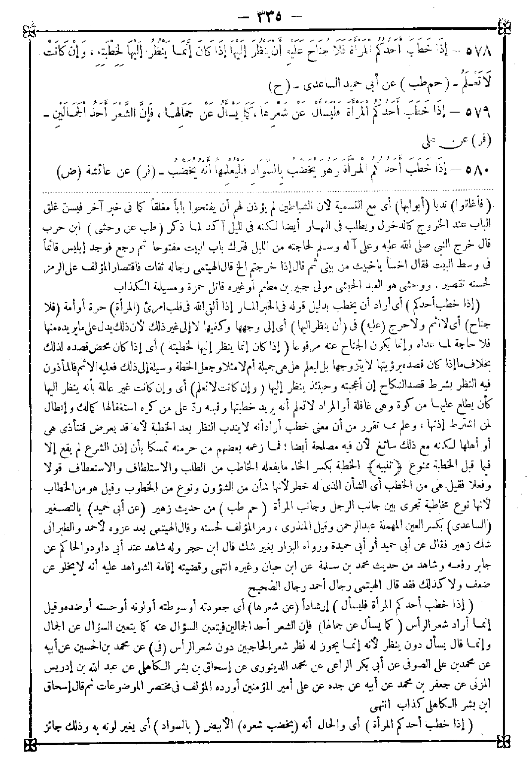 579 - (إذا خطب أحدكم المرأة فليسأل) إرشادا (عن شعرها) أي جعودته أو سوطته أو لونه أو حسنه أو ضده وقيل إنما أراد شعر الرأس (كما يسأل عن جمالها) فإن الشعر أحد الجمالين فيتعين السؤال عنه كما يتعين السؤال عن الجمال وإنما قال يسأل دون ينظر لأنه إنما يجوز له نظر شعر الحاجبين دون شعر الرأس (في) عن محمد بن الحسين عن أبيه عن محمد بن علي الصوفي عن أبي بكر الراعي عن محمد الدينوري عن إسحاق بن بشر الكاهلي عن عبد الله بن إدريس المزني عن جعفر بن محمد عن أبيه عن جده عن علي أمير المؤمنين أورده المؤلف في مختصر الموضوعات ثم قال إسحاق ابن بشر الكاهلي كذاب انتهى