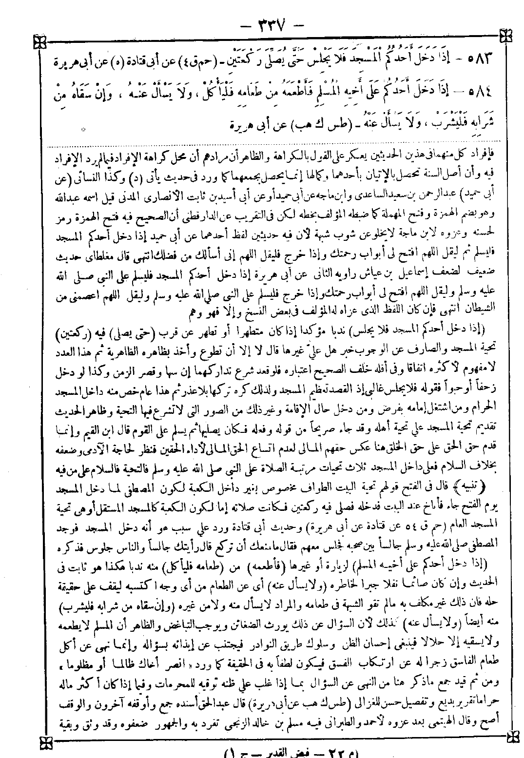 583 - (إذا دخل أحدكم المسجد فلا يجلس) ندبا مؤكدا إذا كان متطهرا أو تطهر عن قرب (حتى يصلي) فيه (ركعتين) تحية المسجد والصارف عن الوجوب خبر هل علي غيرها قال لا إلا أن تطوع وأخذ بظاهره الظاهرية ثم هذا العدد لا مفهوم لأكثره اتفاقا وفي أفله خلف الصحيح اعتباره فلو قعد شرع تداركهما إن سها وقصر الزمن وكذا لو دخل زحفا أو حبوا فقوله فلا يجلس غالبي إذ القصد تعظيم المسجد ولذلك كره تركها بلا عذر ثم هذا عام خص منه داخل المسجد الحرام ومن اشتغل إمامه بفرض ومن دخل حال الإقامة وغير ذلك من الصور التي لا تشرع فيها التحية وظاهر الحديث تقديم نحية المسجد على تحية أهله وقد جاء صريحا من قوله وفعله فكان يصليها ثم يسلم على القوم. قال ابن القيم: وإنما قدم حق الحق على حق الخلق هنا عكس حقهم المالي لعدم اتساع الحق المالي لأداء الحقين فنظر لحاجة الآدمي وضعفه بخلاف السلام فعلى داخل المسجد ثلاث تحيات مرتبة الصلاة على النبي صلى الله عليه وسلم فالتحية فالسلام على من فيه <تنبيه> قال في الفتح: قولهم تحية البيت الطواف مخصوص بغير داخل الكعبة لكون المصطفى لما دخل المسجد يوم الفتح جاء فأناخ عند البيت فدخله فصلى فيه ركعتين فكانت صلاته إما لكون الكعبة كالمسجد المستقل أو هي تحية المسجد العام