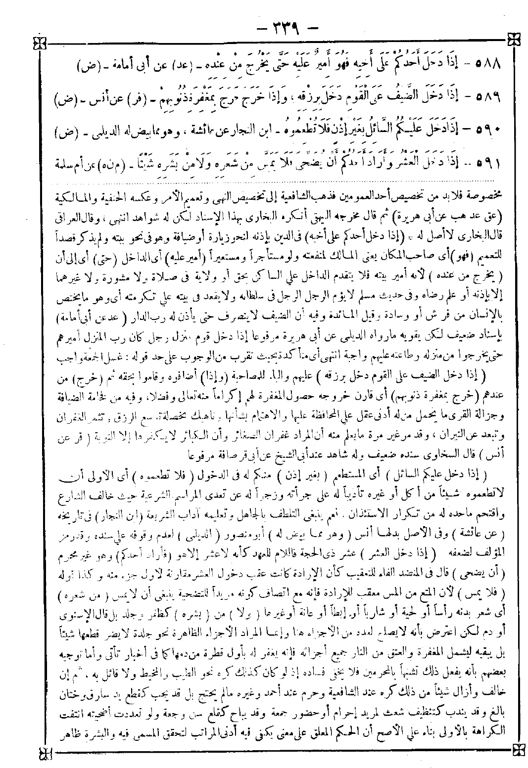 588 - (إذا دخل أحدكم على أخيه) في الدين بإذنه لنحو زيارة أو ضيافة وهو في نحو بيته ولم يذكر قصدا للتعميم (فهو) أي صاحب المكان يعني المالك لمنفعته ولو مستأجرا ومستعيرا (أمير عليه) أي الداخل (حتى) أي إلى أن (يخرج من عنده) لأنه أمير بيته فلا يتقدم الداخل على الساكن بحق أو ولاية في صلاة ولا مشورة ولا غيرهما إلا بإذنه أو علم رضاه وفي حديث مسلم لا يؤم الرجل الرجل في سلطانه ولا يقعد في بيته على تكرمته أي وهو ما يختص بالإنسان من فرش أو وسادة وقيل المائدة وفيه أن الضيف لا ينصرف حتى يأذن له رب الدار