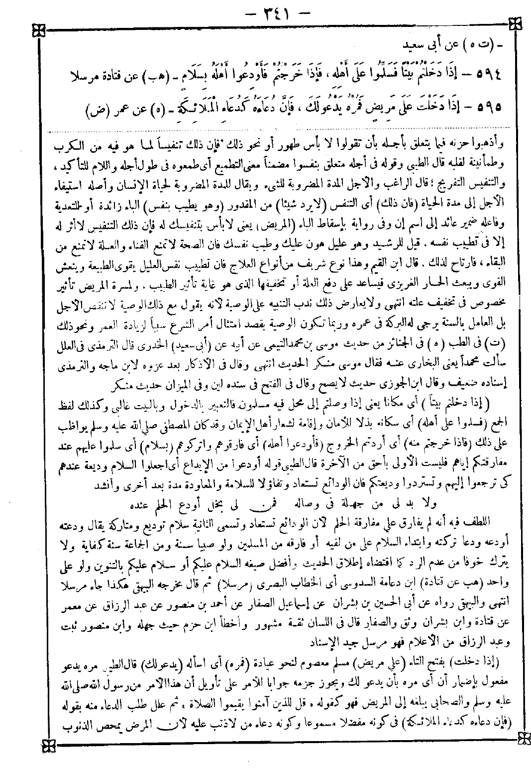 594 - (إذا دخلتم بيتا) أي مكانا يعني إذا وصلتم إلى محل فيه مسلمون فالتعبير بالدخول وبالبيت غالبي وكذلك لفظ الجمع (فسلموا على أهله) أي سكانه بدلا للأمان وإقامة لشعار أهل الإيمان وقد كان المصطفى صلى الله عليه وسلم يواظب على ذلك (فإذا خرجتم منه) أي أردتم الخروج (فأودعوا أهله) أي فارقوهم واتركوهم (بسلام) أي سلموا عليهم عند مفارقتكم إياهم فليست الأولى بأحق من الآخرة قال الطيبي: قوله أودعوا من الإيداع أي اجعلوا السلام وديعة عندهم كي ترجعوا إليهم وتستردوا وديعتكم فإن الودائع تستعاد وتفاؤلا للسلامة والمعاودة مدة بعد أخرى وأنشد: