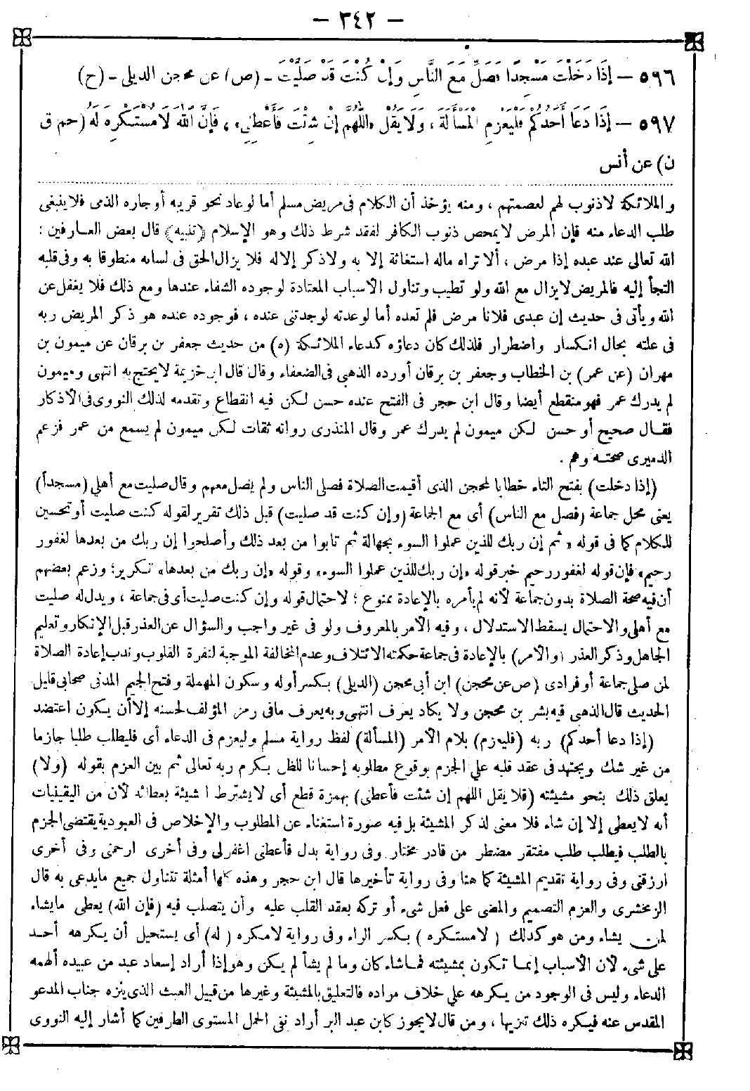597 - (إذا دعا أحدكم) ربه (فليعزم) بلام الأمر (المسألة) لفظ رواية مسلم وليعزم في الدعاء أي فليطلب طلبا جازما من غير شك ويجتهد في عقد قلبه على الجزم بوقوع مطلوبه إحسانا للظن بكرم ربه تعالى ثم بين العزم بقوله (ولا) يعلق ذلك بنحو مشيئته (فلا يقل اللهم إن شئت فأعطني) بهمزة قطع أي لا يشترط المشيئة بعطائه لأن من اليقينيات أنه لا يعطي إلا إن شاء فلا معنى لذكر المشيئة بل فيه صورة استغناء عن المطلوب والإخلاص في العبودية يقتضي الجزم بالطلب فيطلب طلب مفتقر مضطر من قادر مختار وفي رواية بدل فأعطني اغفر لي وفي أخرى ارحمني وفي أخرى ارزقني وفي رواية تقديم المشيئة كما هنا وفي رواية تأخيرها قال ابن حجر: وهذه كلها أمثلة تتناول جميع ما يدعى به قال الزمخشري: والعزم التصميم والمضي على فعل شيء أو تركه بعقد القلب عليه وأن يتصلب فيه (فإن الله) يعطي ما يشاء لمن يشاء ومن هو كذلك (لا مستكره) بكسر الراء وفي رواية لا مكره (له) أي يستحيل أن يكرهه أحد على شيء لأن الأسباب إنما تكون بمشيئته فما شاء كان ما لم يشأ لم يكن وهو إذا أراد إسعاد عبد من عبيده ألهمه الدعاء وليس في الوجود من يكرهه على خلاف مراده فالتعليق بالمشيئة وغيرها من قبيل العبث الذي ينزه جناب المدعو المقدس عنه فيكره ذلك تنزيها ومن قال لا يجوز كابن عبد البر أراد نفي الحمل المستوي الطرفين كما أشار إليه النووي -[343]- فإطلاق التحريم بدون هذه الإرادة سقيم وفيه ندب إلى رجاء الإجابة. قال ابن عيينة: لا يمنعن أحدكم الدعاء ما يجد في نفسه من التقصير فإنه تعالى أجاب دعاء شر خلقه إبليس حين قال {أنظرني. . إلخ} وفيه أن الرب لا يفعل إلا ما يشاء لا يكرهه أحد على ما يختاره كما قد يكره الشافع المشفوع له عنده وكما يكره السائل المسؤول إذا ألح عليه فالرغبة يجب أن تكون إليه كما قال {وإلى ربك فارغب} والرهبة تكون منه كما قال {وإياي فارهبون}