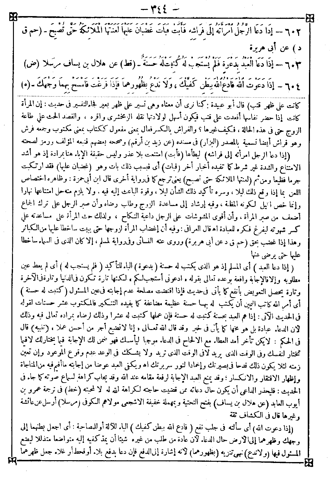 602 - (إذا دعا الرجل امرأته إلى فراشه) ليطأها (فأبت) امتنعت بلا عذر وليس حقيقة الإباء هنا بمرادة إذ هو أشد الامتناع والشدة غير شرط كما تفيده أخبار أخر (فبات) أي فبسبب ذلك بات وهو (غضبان عليها) فقد ارتكبت جرما فظيعا ومن ثم (لعنتها الملائكة حتى تصبح) يعني ترجع كما في رواية أخرى قال ابن أبي حمزة: وظاهره اختصاص اللعن بما إذا وقع ذلك ليلا وسره تأكيد ذلك الشأن ليلا وقوة الباعث إليه فيه ولا يلزم منه حل امتناعها نهارا وإنما خص الليل لكونه المظنة وفيه إرشاد إلى مساعدة الزوج وطلب رضاه وأن يصبر الرجل على ترك الجماع أضعف من صبر المرأة وأن أقوى المشوشات على الرجل داعية النكاح ولذلك حث المرأة على مساعدته على كسر شهوته ليفرغ فكره للعبادة أه. قال العراقي: وفيه أن إغضاب المرأة لزوجها حتى يبيت ساخطا عليها من الكبائر وهذا إذا غضب بحق
