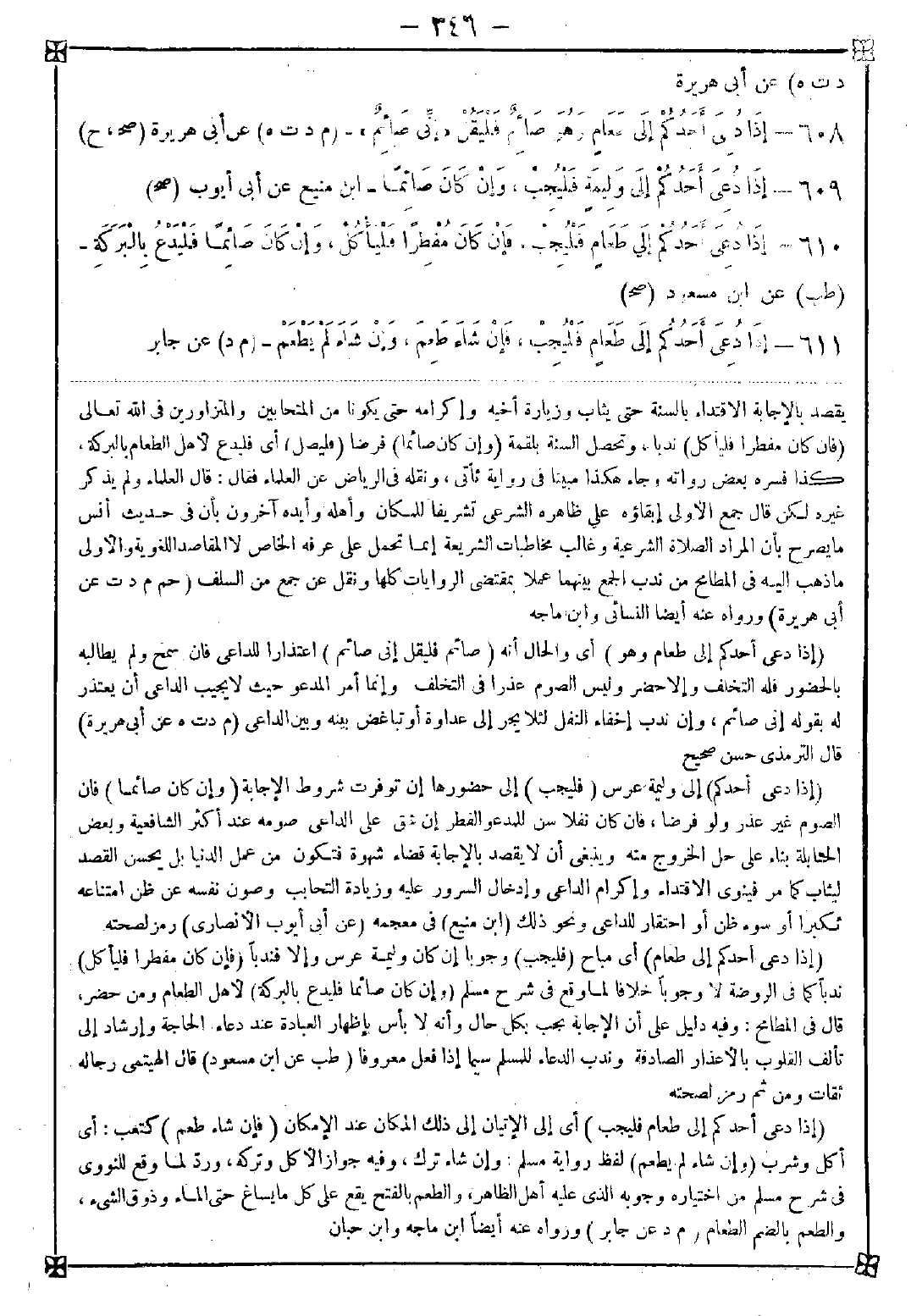 609 - (إذا دعي أحدكم) إلى وليمة عرس (فليجب) إلى حضورها إن توفرت شروط الإجابة (وإن كان صائما) فإن الصوم غير عذر ولو فرضا فإن كان نفلا سن للمدعو الفطر إن شق على الداعي صومه عند أكثر الشافعية وبعض الحنابلة بناء على حل الخروج منه وينبغي أن لا يقصد بالإجابة قضاء شهوة فتكون من عمل الدنيا بل يحسن القصد ليثاب كما مر فينوي الإقتداء وإكرام الداعي وإدخال السرور عليه وزيادة التحابب وصون نفسه عن ظن امتناعه تكبرا أو سوء ظن أو احتقار للداعي ونحو ذلك