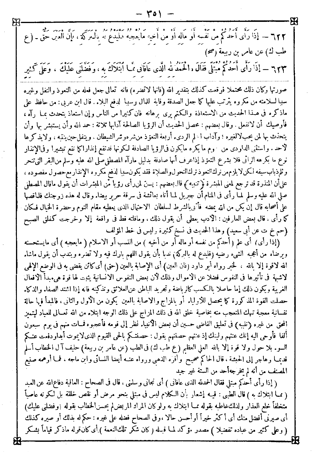 623 - (إذا رأى أحدكم مبتلى فقال الحمد لله الذي عافاني) أي نجاني وسلمني قال في الصحاح: العافية دفاع الله عن العبد (مما ابتلاك به) قال الطيبي: فيه إشعار بأن الكلام ليس في مبتلى بنحو مرض أو نقص خلقة بل لكونه عاصيا متخلفا خلع العذار ولذلك خاطبه بقوله مما ابتلاك به ولو كان المراد المريض لم يحسن الخطاب بقوله (وفضلني عليك) أي صيرني أفضل منك أي أكثر خيرا أو أحسن حالا وفي الصحاح فضله على غيره: حكم له بذلك أو صيره كذلك (وعلى كثير من عباده) مصدر مؤكد لما قبله (كان شكر تلك النعمة) أي كان قوله ما ذكر قياما بشكر -[352]- تلك النعمة المنعم بها عليه وهي معافاته من ذلك البلاء والخطاب في قوله: ابتلاك وعليك: يؤذن بأن يظهر له ذلك ويسمعه إياه وموضعه ما إذا لم يخف فتنته <تنبيه> قال بعض العارفين: الحديث وارد في حق العامة أما الكامل فينظر فيما انطوى عليه ذلك الابتلاء فإن كان كفارة أو رفع درجات لم يسأل العافية منه والعارف يحمل كل حديث على حاله