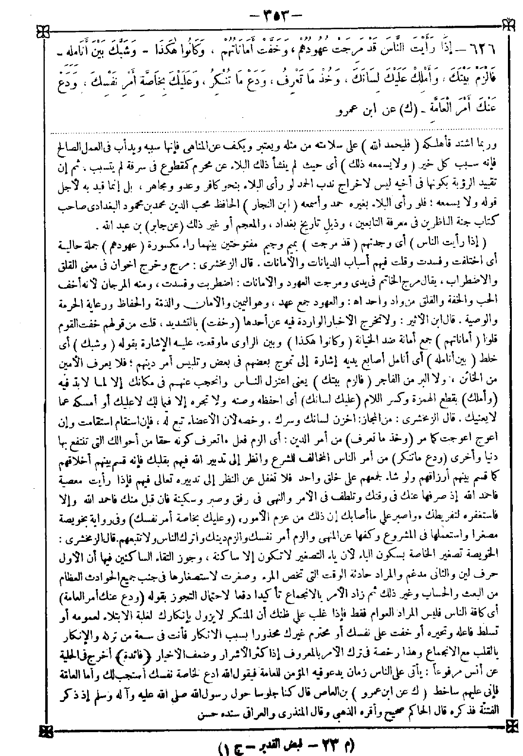 626 - (إذا رأيت الناس) أي وجدتهم (قد مرجت) بميم وجيم مفتوحتين بينهما راء مكسورة (عهودهم) جملة حالية أي اختلفت وفسدت وقلت فيهم أسباب الديانات والأمانات. قال الزمخشري: مرج وخرج إخوان في معنى القلق والاضطراب يقال مرج الخاتم في يدي ومرجت العهود والأمانات: اضطربت وفسدت ومنه المرجان لأنه أخف الحب والخفة والقلق من واد واحد أه: والعهود جمع عهد وهو اليمين والأمان والذمة والحفاظ ورعاية الحرمة والوصية. قال ابن الأثير: ولا تخرج الأخبار الواردة فيه عن أحدهما (وخفت) بالتشديد قلت من قولهم خفت القوم قلوا (أماناتهم) جمع أمانة ضد الخيانة (وكانوا هكذا) وبين الراوي ما وقعت عليه الإشارة بقوله (وشبك) أي خلط (بين أنامله) أي أنامل أصابع يديه إشارة إلى تموج بعضهم في بعض وتلبيس أمر دينهم فلا يعرف الأمين من الخائن ولا البر من الفاجر (فالزم بيتك) يعني اعتزل الناس وانحجب عنهم في مكانك إلا لما لا بد فيه (وأملك) بقطع الهمزة وكسر اللام (عليك لسانك) أي احفظه وصنه ولا تجره إلا فيما لك لا عليك أو امسكه عما لا يعنيك. قال الزمخشري: من المجاز اخزن لسانك وسرك. وخصه لأن الأعضاء تبع له فإن استقام استقامت وإن اعوج اعوجت كما مر (وخذ ما تعرف) من أمر الدين: أي الزم فعل ما تعرف كونه حقا من أحوالك التي تنتفع بها دنيا وأخرى (ودع ما تنكر) من أمر الناس المخالف للشرع وانظر إلى تدبير الله فيهم بقلبك فإنه قسم بينهم أخلاقهم كما قسم بينهم أرزاقهم ولو شاء لجمعهم على خلق واحد فلا تغفل عن النظر إلى تدبيره تعالى فيهم فإذا رأيت معصية فاحمد الله إذ صرفها عنك في وقتك وتلطف في الأمر والنهي في رفق وصبر وسكينة فإن قبل منك فاحمد الله وإلا فاستغفره لتفريطك {واصبر على ما أصابك إن ذلك من عزم الأمور} (وعليك بخاصة نفسك) وفي رواية بخويصة مصغرا واستعملها في المشروع وكفها عن المنهي والزم أمر نفسك والزم دينك واترك الناس ولا تتبعهم. قال الزمخشري: الخويصة تصغير الخاصة بسكون الياء لأن ياء التصغير لا تكون إلا ساكنة وجوز إلتقاء الساكنين فيها أن الأول حرف لين والثاني مدغم والمراد حادثة الوقت التي تخص المرء وصغرت لاستصغارها في جنب جميع الحوادث العظام من البعث والحساب وغير ذلك ثم زاد الأمر بالانجماع تأكيدا دفعا لاحتمال التجوز بقوله (ودع عنك أمر العامة) أي كافة الناس فليس المراد العوام فقط فإذا غلب على ظنك أن المنكر لا يزول بإنكارك لغلبة الابتلاء لعمومه أو تسلط فاعله وتحيره أو خفت على نفسك أو محترم غيرك محذورا بسبب الإنكار فأنت في سعة من تركه والإنكار بالقلب مع الانجماع وهذا رخصة في ترك الأمر بالمعروف إذا كثر الأشرار وضعف الأخيار <فائدة> أخرج في الحلية عن أنس مرفوعا " يأتي على الناس زمان يدعو فيه المؤمن للعامة فيقول الله ادع لخاصة نفسك أستجب لك وأما العامة فإني عليهم ساخط "