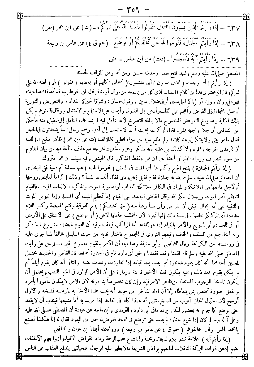 638 - (إذا رأيتم الجنازة) بفتح الجيم وكسرها أي الميت في النعش (فقوموا لها) هبها مسلمة أم ذمية ففي البخاري أن المصطفى صلى الله عليه وسلم مرت به جنازة فقام فقيل له إنه يهودي فقال أليست نفسا؟ وذلك إكراما لقابض روحها أو لأجل ما معها من الملائكة والمراد في الكافر ملائكة العذاب أو لصعوبة الموت وتذكره لا لذات الميت فالقيام لتعظيم أمر الموت وإجلال حكم الله. وقال القاضي: الباعث على القيام إما تعظيم الميت أي المسلم وإما تهويل الموت والتنبيه على أنه بحال ينبغي أن يفر من رأى ميتا رعبا منه (حتى تخلفكم) بضم الفوقية وفتح المعجمة وكسر اللام مشددة أي تترككم خلفها وفي نسبة ذلك إليها تجوز لأن المخلف حاملها لا هي (أو توضع) عن الأعناق على الأرض أو في اللحد وأو للتنويع والأمر بالقيام إنما هو للقاعد أما الراكب فيقف وفيه أن القيام للجنازة مشروع لما ذكر وبه أخذ جمع من السلف والخلف وتبعهم النووي في المجموع فاختار ندبه من حيث الدليل مخالفا لما جرى عليه في روضته من الكراهة. وقال الشافعي وأبو حنيفة وصاحباه أن الأمر بالقيام منسوخ لخبر مسلم عن علي رأيت المصطفى صلى الله عليه وسلم قام فقمنا وقعد فقعدنا وخبر أبي داود قام في الجنازة ثم قعد. قال القاضي: والحديث محتمل لمعنيين أحدهما أنه كان يقوم للجنازة ثم يقعد بعد قيامه إذا نجاوزت وبعدت عنه والثاني أنه كان يقوم أياما ثم لم يكن يقوم بعد ذلك وعليه يكون فعله الأخير قرينة وإمارة على أن الأمر الوارد في الخبر للندب ويحتمل أن يكون ناسخا للوجوب المستفاد من ظاهر الأمر وإن كان مخصوصا بنا دونه لأن الآمر لا يكون مأمورا بأمره والفعل صورة تختص بمن يتعاطاه إلا أن فعله المتأخر من حيث أنه يجب علينا الأخذ به عارضه فنسخه والأول أرحج لأن احتمال المجاز أقرب من النسخ انتهى. ثم هذا كله في القاعد إذا مرت به أما مشيعها فيندب أن لا يقعد حتى توضع كما جزم به بعضهم لكن يرده ما في أبي داود والترمذي وابن ماجه عن عبادة أن المصطفى صلى الله عليه وسلم كان إذا شيع جنازة لم يقعد حتى توضع في اللحد فعرض له حبر من اليهود فقال له إنا هكذا نصنع يا محمد فجلس وقال خالفوهم
