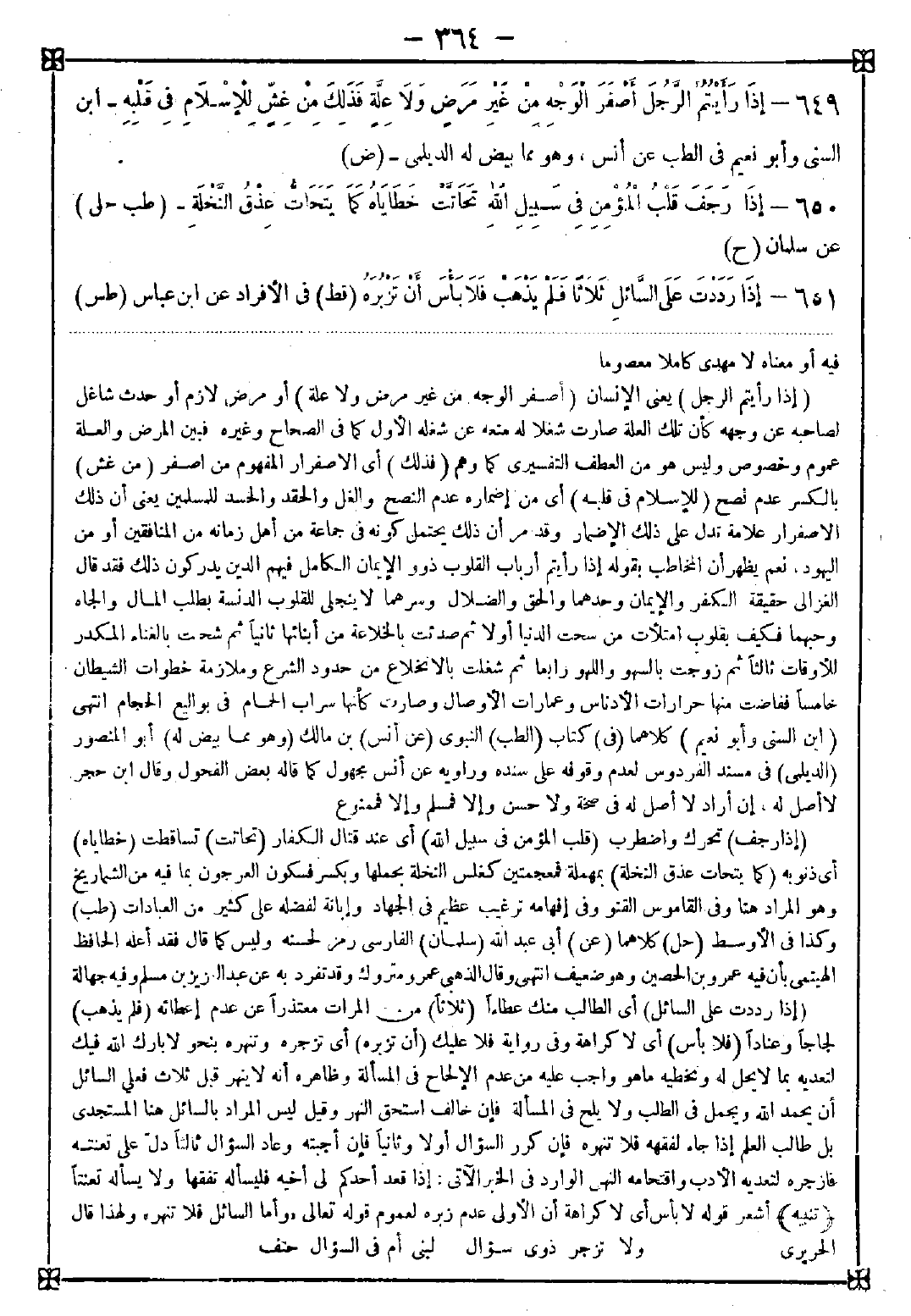 649 - (إذا رأيتم الرجل) يعني الإنسان (أصفر الوجه من غير مرض ولا علة) أو مرض لازم أو حدث شاغل لصاحبه عن وجهه كأن تلك العلة صارت شغلا له منعه عن شغله الأول كما في الصحاح وغيره فبين المرض والعلة عموم وخصوص وليس هو من العطف التفسيري كما وهم (فذلك) أي الاصفرار المفهوم من أصفر (من غش) بالكسر عدم نصح (للإسلام في قلبه) أي من إضماره عدم النصح والغل والحقد والحسد للمسلمين يعني أن ذلك الاصفرار علامة تدل على ذلك الإضمار وقد مر أن ذلك يحتمل كونه في جماعة من أهل زمانه من المنافقين أو من اليهود. نعم يظهر أن المخاطب بقوله إذا رأيتم أرباب القلوب ذوو الإيمان الكامل فيهم الذين يدركون ذلك فقد قال الغزالي: حقيقة الكفر والإيمان وحدهما والحق والضلال وسرهما لا ينجلي للقلوب الدنسة بطلب المال والجاه وحبهما فكيف بقلوب امتلأت من سحت الدنيا أولا ثم صدئت بالخلاعة من أبنائها ثانيا ثم شحت بالغناء المكدر للأوقات ثالثا ثم زوجت بالسهو واللهو رابعا ثم شغلت بالانخلاع من حدود الشرع وملازمة خطوات الشيطان خامسا ففاضت منها حرارات الأدناس وعمارات الأوصال وصارت كأنها سراب الحمام في بواليع الحجام انتهى