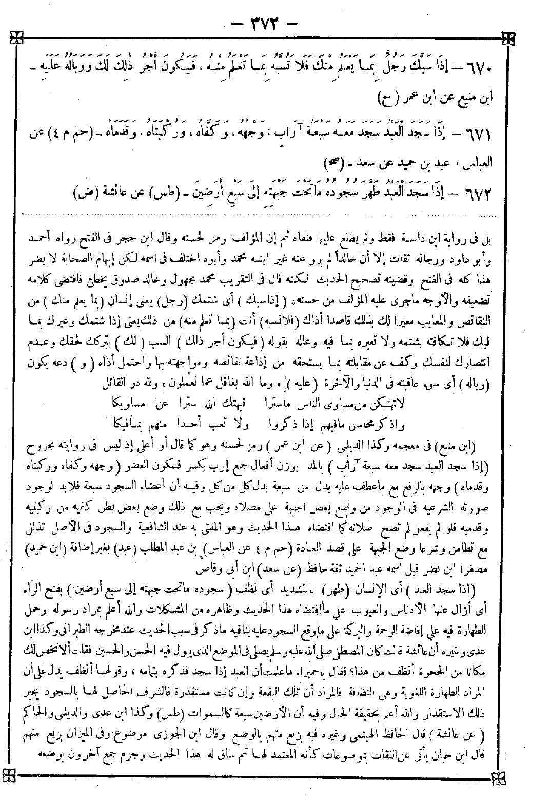671 - (إذا سجد العبد سجد معه سبعة آراب) بالمد بوزن أفعال جمع إرب بكسر فسكون العضو (وجهه وكفاه وركبتاه وقدماه) وجهه بالرفع مع ما عطف عليه بدل من سبعة بدل كل من كل وفيه أن أعضاء السجود سبعة فلا بد لوجود صورته الشرعية في الوجود من وضع بعض الجبهة على مصلاه ويجب مع ذلك وضع بعض بطن كفيه من ركبتيه وقدميه فلو لم يفعل لم تصح صلاته كما اقتضاه هذا الحديث وهو المفتي به عند الشافعية والسجود في الأصل تذلل مع تطامن وشرعا وضع الجبهة على قصد العبادة
