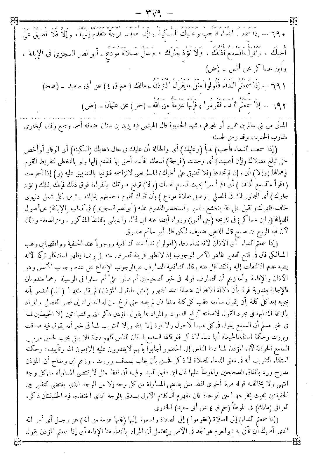 691 - (إذا سمعتم النداء) أي الأذان لأنه نداء دعاء (فقولوا) ندبا عند الشافعية ووجوبا عند الحنفية ووافقهم ابن وهب المالكي قال في فتح القدير ظاهر الأمر الوجوب إذ لا تظهر قرينة تصرف عنه بل ربما يظهر استنكارا تركه لأنه يشبه عدم الالتفات إليه والتشاغل عنه وقال الشافعية الصارف عن الوجوب الإجماع على عدم وجوب الأصل وهو الأذان والإقامة وأما زعم أن الصارف قوله في خبر الصحيحين ثم صلوا علي ثم سلوا لي الوسيلة وهما مندوبان فالإجابة مندوبة فرد بأن دلالة الإقتران ضعيفة عند الجمهور (مثل ما يقول المؤذن) لم يقل مثلهما (قال) ليشعر بأنه يجيبه بعد كل كلمة بأن يقول سامعه عقب كل كلمة مثلها فإن لم يجبه حتى فرغ سن له التدارك إن قصر الفصل والمراد بالمماثلة المشابهة في مجرد القول لا صفته كرفع الصوت والمراد بما يقول المؤذن ذكر الله والشهادتين إلا الحيعلتين لما في خبر مسلم أن السامع يقول في كل منهما لاحول ولا قوة إلا بالله وإلا التثويب لما في خبر أنه يقول فيه صدقت وبررت وحكمة استثناء الحيلعة أنها دعاء لا ذكر فلو قالها السامع لكان الناس كلهم دعاة فلا يبقى مجيب فحسن من السامع الحوقلة لأن المؤذن لما دعا الناس إلى الحضور أجابوا بأنهم لا يقدرون عليه إلا بعون الله وتأييده: وحكمته استثناء التثويب أنه في معنى الدعاء للصلاة لا ذكر فحسن بأن يجاب بصدقت وبررت. وزعم ابن وضاح أن المؤذن مدرج ورد باتفاق الصحيحين والموطأ عليها قال ابن دقيق العيد: وفيه أن لفظ مثل لا يقتضي المساواة من كل وجه انتهى ولا يخالفه قوله مرة أخرى لفظ مثل يقتضي المساواة من كل وجه إلا من الوجه الذي يقتضي التغاير بين الحقيقتين بحيث يخرجهما عن الوحدة فإن مفهوم الكلام الأول يصدق بالوجه الذي اختلفت فيه الحقيقتان ذكره العراقي