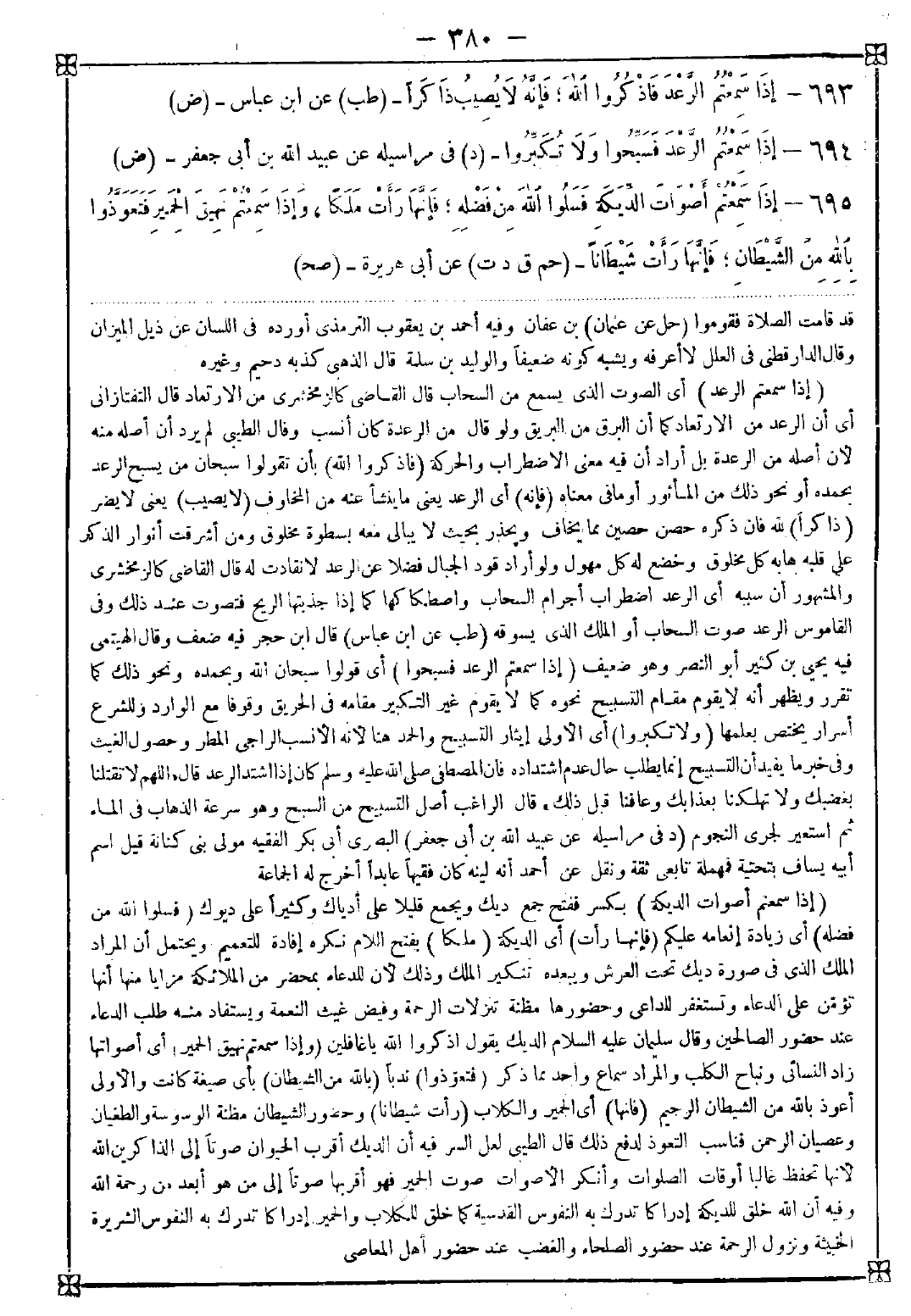 693 - (إذا سمعتم الرعد) أي الصوت الذي يسمع من السحاب قال القاضي كالزمخشري من الارتعاد قال التفتازاني أي أن الرعد من الارتعاد كما أن البرق من البريق ولو قال من الرعدة كان أنسب وقال الطيبي: لم يرد أن أصله منه لأن أصله من الرعدة بل أراد أن فيه معنى الاضطراب والحركة (فاذكروا الله) بأن تقولوا سبحان من يسبح الرعد بحمده أو نحو ذلك من المأثور أو ما في معناه (فإنه) أي الرعد يعني ما ينشأ عنه من المخاوف (لا يصيب) يعني لا يضر (ذاكرا) لله فإن ذكره حص حصين مما يخاف ويحذر بحيث لا يبالي معه بسطوة مخلوق ومن أسرقت أنوار الذكر على قلبه هابه كل مخلوق وخضع له كل مهول ولو أراد قود الجبال فضلا عن الرعد لانقادت له قال القاضي كالزمخشري والمشهور أن سببه أي الرعد اضطراب أجرام السحاب واصطكاكها كما إذا جذبتها الريح فتصوت عند ذلك وفي القاموس الرعد صوت السحاب أو الملك الذي يسوقه