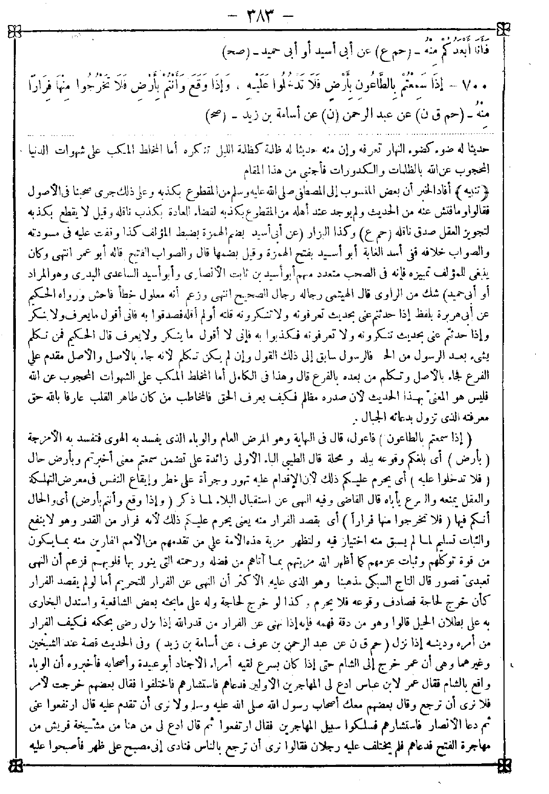 (حم ق ن عن عبد الرحمن بن عوف عن أسامة بن زيد) وفي الحديث قصة عند الشيخين وغيرهما وهي أن عمر خرج إلى الشام حتى إذا كان بسرع لقيه أمراء الأجناد أبو عبيدة وأصحابه فأخبروه أن الوباء واقع بالشام فقال عمر لابن عباس ادع لي المهاجرين الأولين فدعاهم فاستشارهم فاختلفوا فقال بعضهم خرجت لأمر فلا نرى أن ترجع وقال بعضهم معك أصحاب رسول الله صلى الله عليه وسلم ولا نرى أن تقدم عليه قال ارتفعوا عني ثم دعا الأنصار فاستشارهم فسلكوا سبيل المهاجرين فقال ارتفعوا ثم قال ادع لي من هنا من مشيخة قريش من مهاجرة الفتح فدعاهم فلم يختلف عليه رجلان فقالوا نرى أن ترجع بالناس فنادى إني مصبح على ظهر فأصبحوا عليه -[384]- فقال أبو عبيدة أفرارا من قدر الله؟ فقال عمر لو غيرك قالها يا أبا عبيدة - وكان عمر يكره خلافه - نعم نفر من قدر الله إلى قضاء الله فجاء ابن عوف وكان متغيبا فقال إن عندي من هذا علما إن رسول الله صلى الله عليه وسلم قال فذكره
