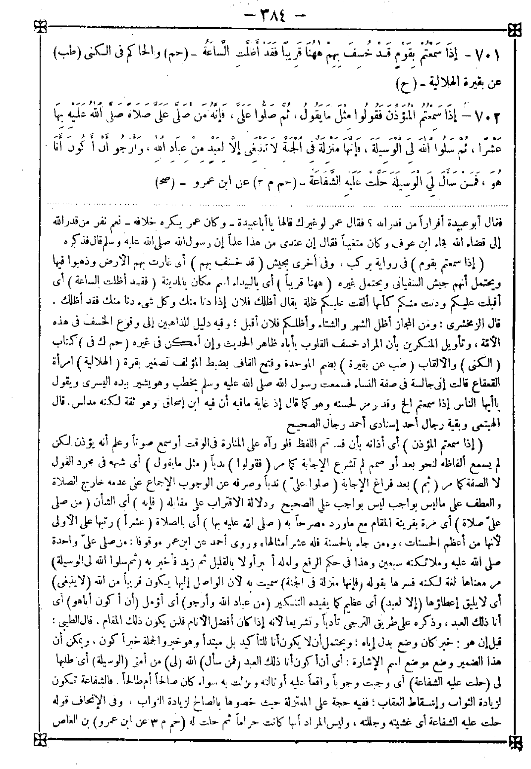 702 - (إذا سمعتم المؤذن) أي أذانه بأن فسرتم اللفظ فلو رآه على المنارة في الوقت أو سمع صوتا وعلم أنه يؤذن لكن لم يسمع ألفاظه لنحو بعد أو صمم لم تشرع الإجابة كما مر (فقولوا) ندبا (مثل ما يقول) أي شبهه في مجرد القول لا الصفة كما مر (ثم) بعد فراغ الإجابة (صلوا علي) ندبا وصرفه عن الوجوب الإجماع على عدمه خارج الصلاة والعطف على ما ليس بواجب ليس بواجب على الصحيح ودلالة الاقتراب على مقابله (فإنه) أي الشأن (من صلى علي صلاة) أي مرة بقرينة المقام مع ما ورد مصرحا به (صلى الله عليه بها) أي بالصلاة (عشرا) رتبها على الأولى لأنها من أعظم الحسنات و {من جاء بالحسنة فله عشر أمثالها} وروى أحمد عن ابن عمر موقوفا: من صلى علي واحدة صلى الله عليه وملائكته سبعين وهذا في حكم الرفع ولعله أكبر أو لا بالقلبل ثم زيد فأخبر به (ثم سلوا الله لي الوسيلة) مر معناها لغة لكنه فسرها بقوله (فإنها منزلة في الجنة) سميت به لأن الواصل إليها يكون قريبا من الله (لا ينبغي) أي لا يليق إعطاؤها (إلا لعبد) أي عظيم كما يفيده التنكير (من عباد الله وأرجو) أي أؤمل (أن أكون أنا هو) أي أنا ذلك العبد وذكره على طريق الترجي تأدبا وتشريعا لأنه إذا كان أفضل الأنام فلمن يكون ذلك المقام. قال الطيبي: قيل إن هو: خبر كان وضع بدل إياه ويحتمل أن لا يكون أنا للتأكيد بل مبتدأ وهو خبر والجملة خبر أكون ويمكن أن هذا الضمير وضع موضع اسم الإشارة: أي أن أكون أنا ذلك العبد (فمن سأل) الله (لي) من أمتي (الوسيلة) أي طلبها لي (حلت عليه الشفاعة) أي وجبت وجوبا واقعا عليه أو نالته ونزلت به سواء كان صالحا أو طالحا. فالشفاعة تكون لزيادة الثواب وإسقاط العقاب ففيه حجة على المعتزلة حيث خصوها بالصالح لزيادة الثواب وفي الإتحاف قوله حلت عليه الشفاعة أي غشيته وجللته وليس المراد أنها كانت حراما ثم حلت له