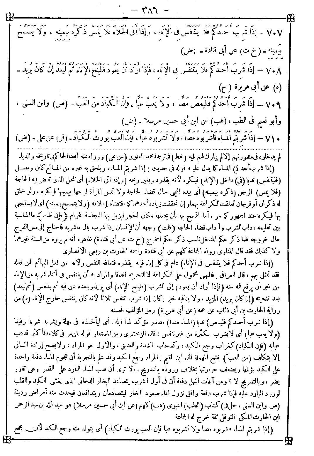 709 - (إذا شرب أحدكم فليمص) ندبا (الماء مصا) مصدر مؤكد لما قبله: أي ليأخذه في مهلة ويشربه شربا رفيقا (ولا يعب عبا) أي لا يشرب بكثرة من غير تنفس. قال الزمخشري: ومن المستعار قوله لمن مر في كلامه فأكثر قد عب عبابة (فإن الكباد) كغراب وجع الكبد وكسحاب الشدة والضيق والأول هو المراد ولا يصح إرادة الثاني إلا بتكلف (من العب) بفتح المهملة قال ابن القيم: المراد وجع الكبد وقد علم بالتجربة أن هجوم الماء دفعة واحدة على الكبد يؤلمها ويضعف حرارتها بخلاف وروده بالتدريج ألا ترى أن صب الماء البارد على القدر وهي تفور يضر وبالتدريج لا؟ ومن آفات النهل دفعة أن في أول الشرب يتصاعد البخار الدخاني الذي يغشى الكبد والقلب لورود البارد عليه فإذا شرب دفعة وافق نزول الماء صعود البخار فيتصادمان ويتدافعان فيحدث منه أمراض رديئة
