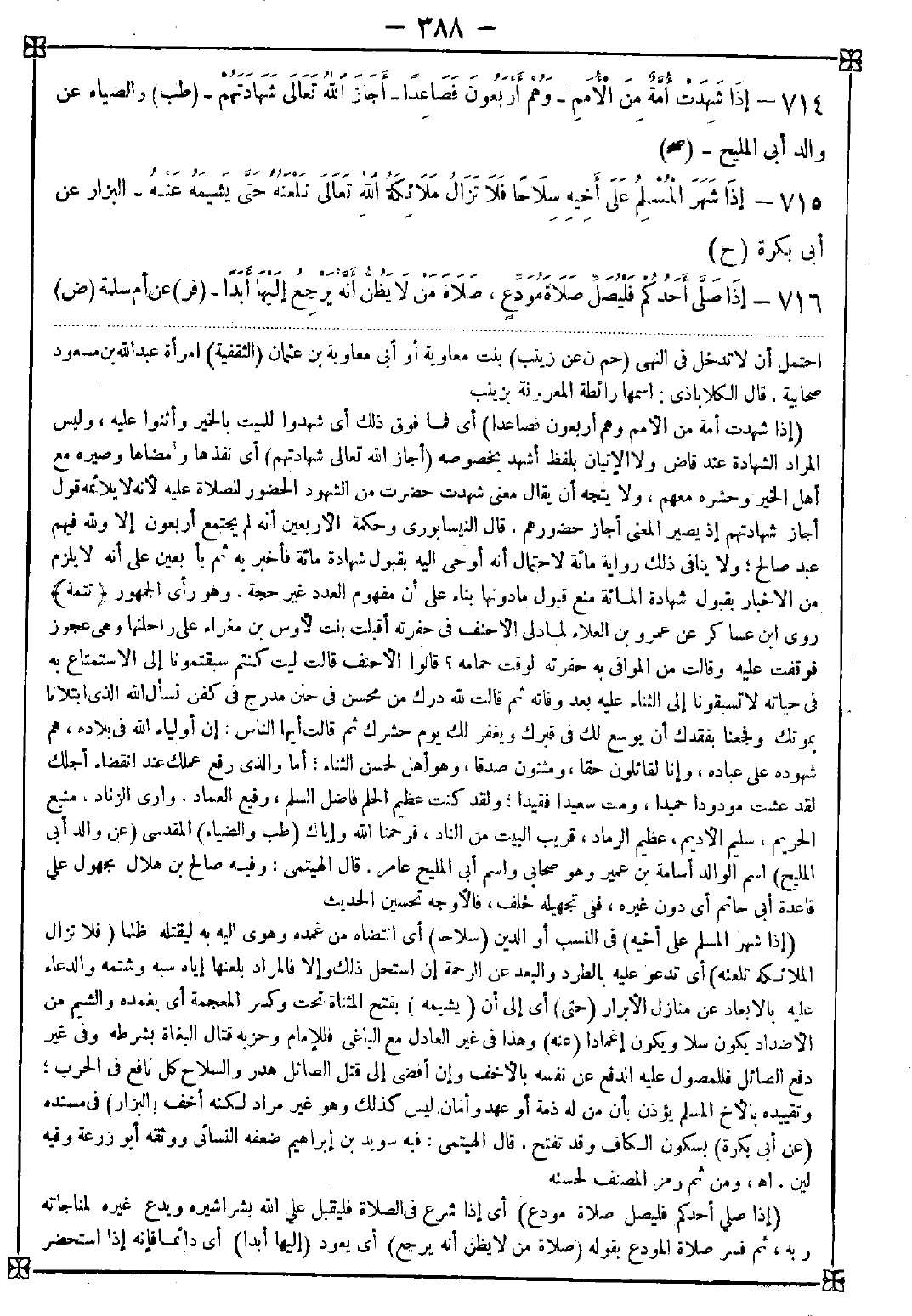 714 - (إذا شهدت أمة من الأمم وهم أربعون فصاعدا) أي فما فوق ذلك أي شهدوا للميت بالخير وأثنوا عليه وليس المراد الشهادة عند قاض ولا الإتيان بلفظ أشهد بخصوصه (أجاز الله تعالى شهادتهم) أي نفذها ومضاها وصيره مع أهل الخير وحشره معهم ولا يتجه أن يقال معنى شهدت حضرت من الشهود الحضور للصلاة عليه لأنه لا يلائمه قول أجاز شهادتهم إذ يصير المعنى أجاز حضورهم. قال النيسابوري: وحكمة الأربعين أن لم يجتمع أربعون إلا ولله فيهم عبد صالح ولا ينافي ذلك رواية مئة لاحتمال أنه أوحي إليه بقبول شهادة مئة فأخبر به ثم بأربعين على أنه لا يلزم من الأخبار بقبول شهادة المئة منع قبول ما دونها بناء على أن مفهوم العدد غير حجة. وهو رأي الجمهور (تتمة) روى ابن عساكر عن عمرو بن العلاء لما دلى الأحنف في حفرته أقبلت بنت لأوس بن مغراء على راحلتها وهي عجوز فوقفت عليه وقالت من الموافي به حفرته لوقت حمامه؟ قالوا الأحنف قالت ليت كنتم سبقتمونا إلى الاستمتاع به في حياته لا تسبقونا إلى الثناء عليه بعد وفاته ثم قالت لله درك من محسن في حنن مدرج في كفن نسأل الله الذي ابتلانا بموتك وفجعنا بفقدك أن يوسع لك في قبرك ويغفر لك يوم حشرك ثم قالت أيها الناس: إن أولياء الله في بلاده هم شهوده على عباده وإنا لقائلون حقا ومثنون صدقا وهو أهل لحسن الثناء أما والذي رفع عملك عند انقضاء أجلك لقد عشت مودودا حميدا ومت سعيدا فقيدا ولقد كنت عظيم الحلم فاضل السلم رفيع العماد واري الزناد منيع الحريم سليم الأديم عظيم الرماد قريب البيت من الناد فرحمنا الله وإياك