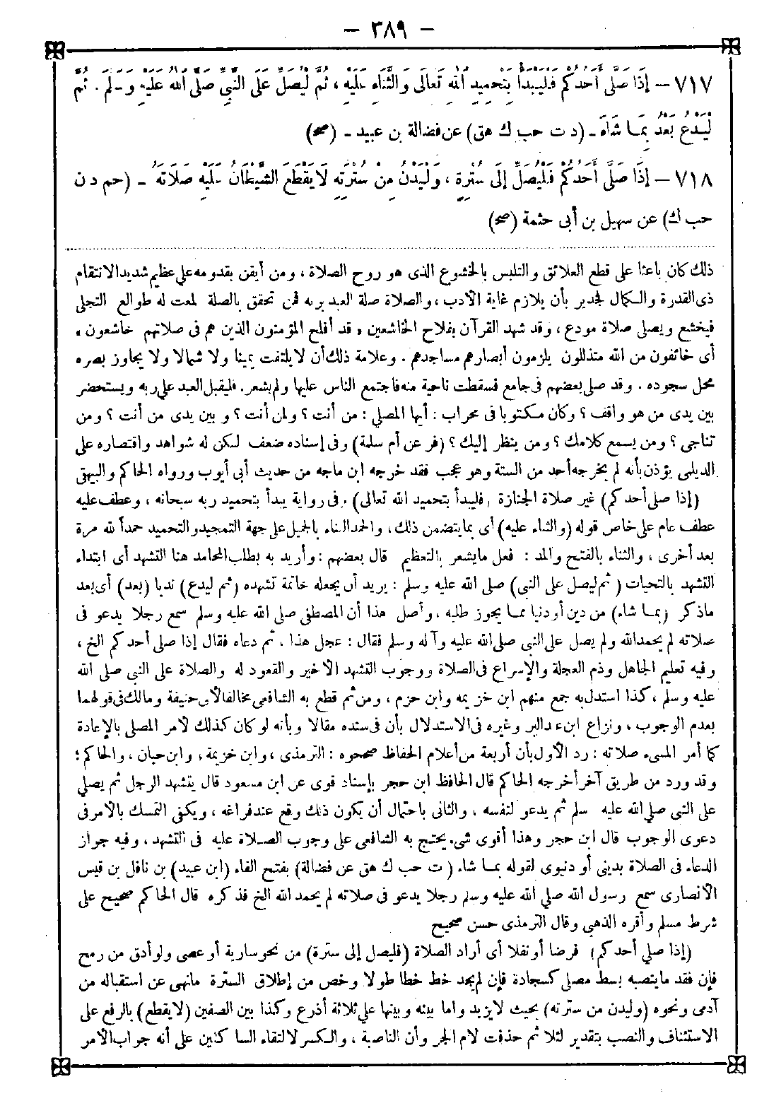 718 - (إذا صلى أحكم) فرضا أو نفلا أي أراد الصلاة (فليصل إلى سترة) من نحو سارية أو عصى ولو أدق من رمح فإن فقد ما ينصبه بسط مصلى كسجادة فإن لم يجد خط خطا طولا وخص من إطلاق السترة ما نهى عن استقباله من آدمي ونحوه (وليدن من سترته) بحيث لا يزيد وأما بينه وبينها على ثلاثة أذرع وكذا بين الصفين (لا يقطع) بالرفع على الاستئناف والنصب بتقدير لئلا ثم حذفت لام الجر وأن الناصبة والكسر لالتقاء الساكنين على أنه جواب الأمر -[390]- وهو: وليدن (الشيطان) أي المار: سمي شيطانا لأن فعله فعل الشيطان لإتيانه بما يشوش على المصلي أو لأن الحامل له على ذلك الشيطان وقيل الشيطان نفسه هو المار والشيطان يطلق حقيقة على الجني ومجازا على الإنسي المار ومن تعقب ذلك لم يأت بطائل (عليه صلاته) يعني ينقصها بشغل قلبه بالمرور بين يديه وتشويشه فليس المراد بالقطع البطلان وفيه تحريم المرور بين يدي المصلي إذا جعل له سترة ومحله إن لم يقصر وإلا كأن وقف بالطريق فلا حرمة بل ولا كراهة كما في الكفاية ولو صلى بلا سترة أو تباعد عنها أو لم تكن السترة بالنعت المذكور فلا حرمة لتقصيره لكنه خلاف الأولى أو مكروه وفيه تنبيه على عظمة الصلاة واحترام المصلي لأنه مناج ربه <تنبيه> ثبت في الصحيح أن المصطفى صلى الله عليه وسلم كان يصلي إلى الاسطوانة ووقع في صحيح مسلم أنه صلى الله عليه وسلم كان يصلي وراء الصندوق وكأنه كان للمصحف صندوق يوضع فيه قال ابن حجر: والاسطوانة المذكورة حقق بعض مشايخنا أنها المتوسطة في الروضة الكريمة وأنها تعرف باسطوانة المهاجرين. قال وروي عن عائشة أنها قالت: لو عرفها الناس لاضطربوا عليها بالسهام وأنها أسرتها إلى ابن الزبير فكان يكثر الصلاة عندها
